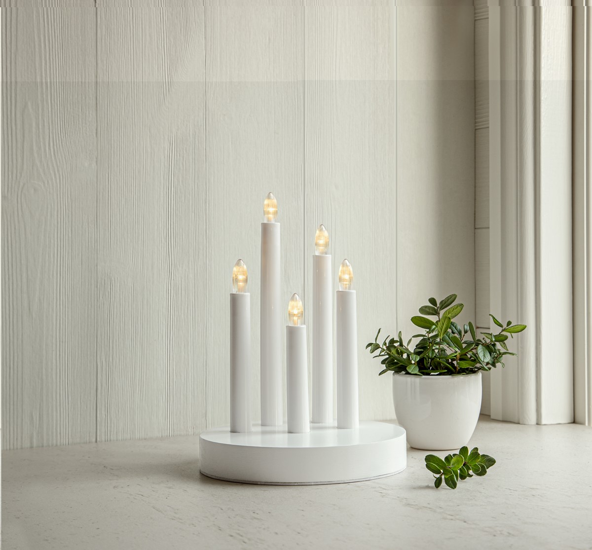 Batteridriven adventsljusstake tillverkad i trä. Ljusstaken är liten och nätt och därför lättplacerad i både fönster och på skänk. LED-lampor som lyser fint och skapar julkänsla i hemmet. Batterier ingår ej (drivs med 2 AA-batterier). Brinntid ca 400 timmar. Höjd 24 cm, bredd 17,5 cm.