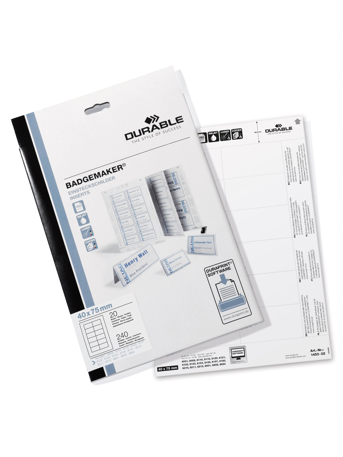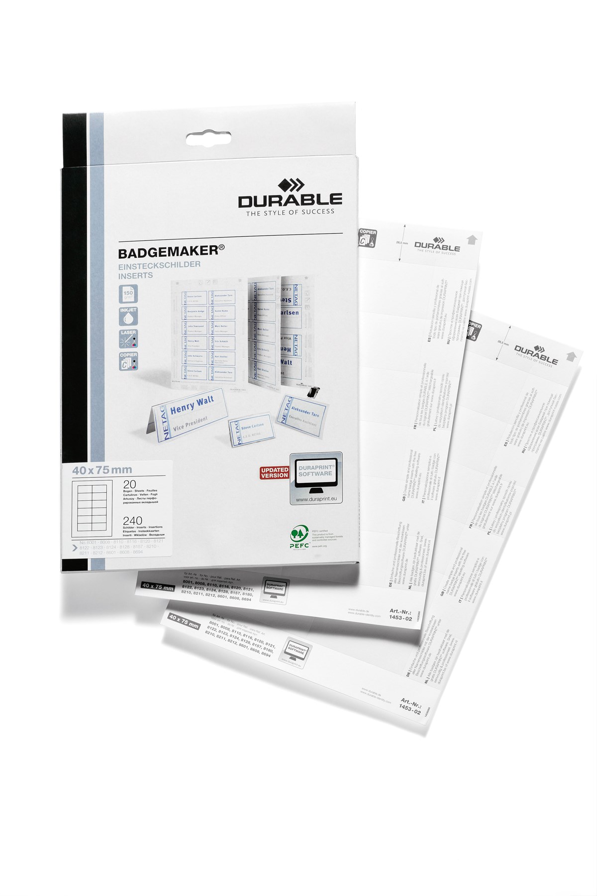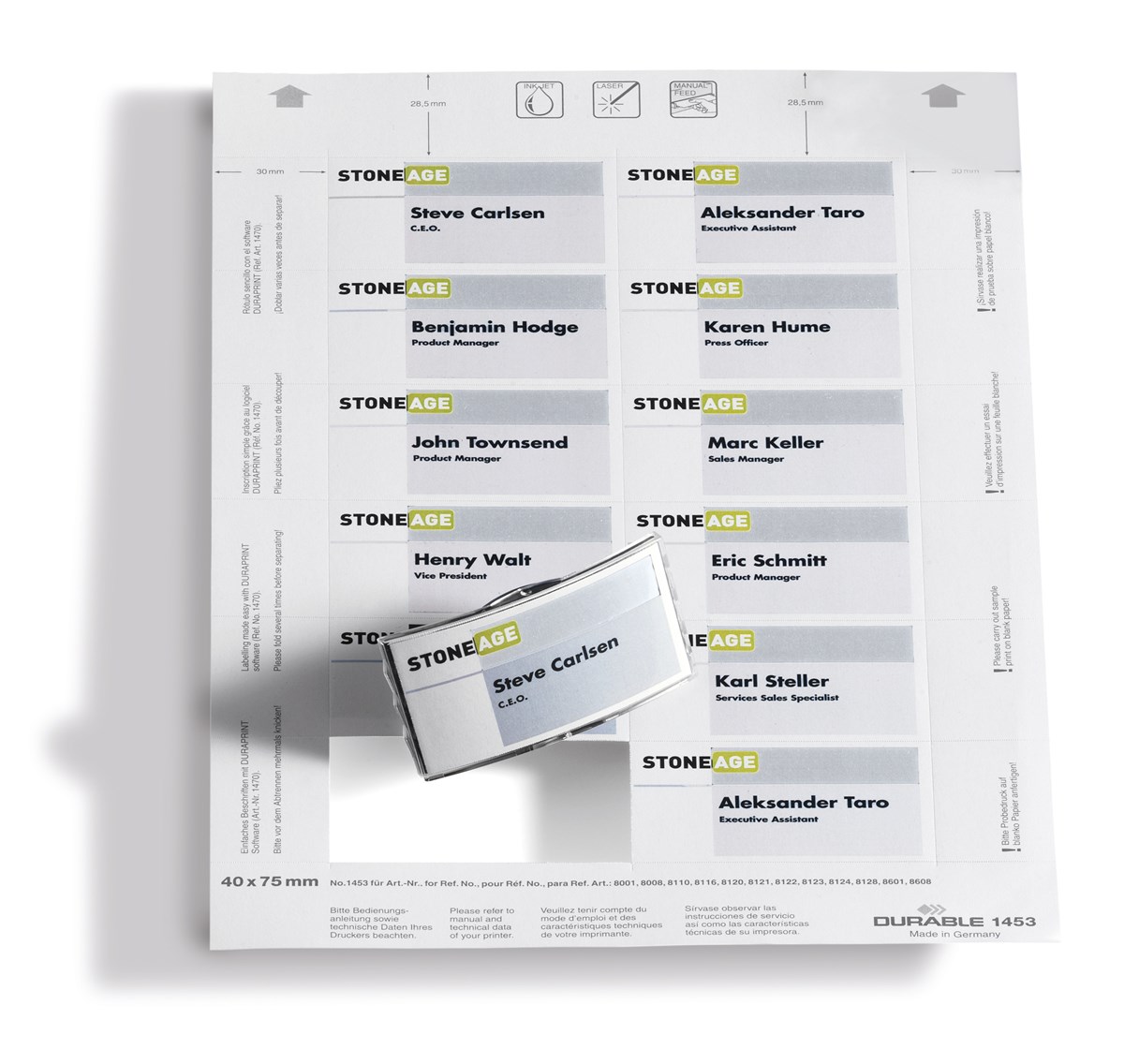 Insticksetiketter på A4-ark (150 grams papper) för professionell utskrift i laser- eller bläckstråleskrivare. Lätt att dela etiketterna med mikroperforeringen. Utskriftsmallar på www.duraprint.se.