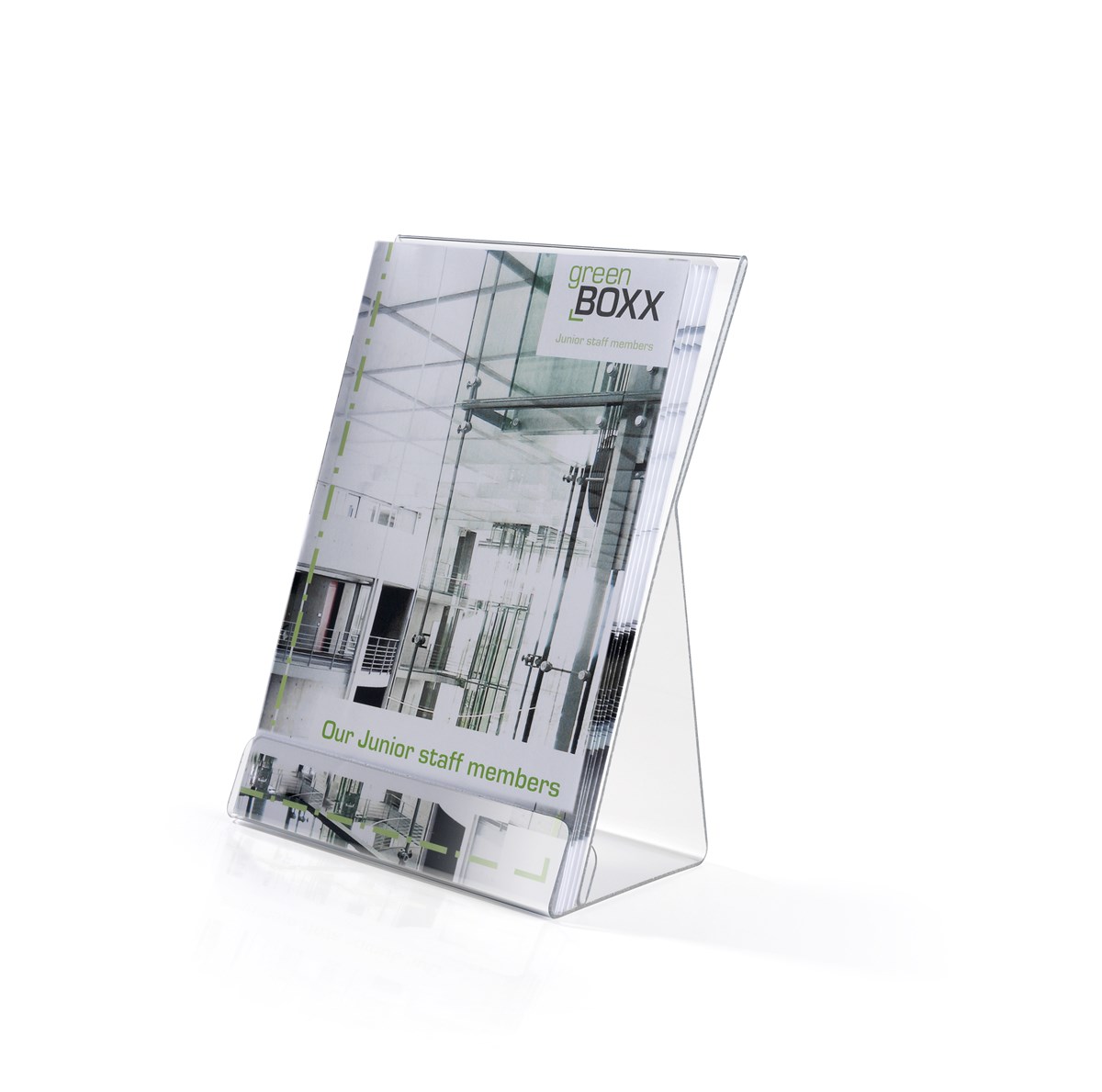 Broschyrställ av transparent polystyrenplast för receptioner, utställningslokaler, mässor m.m. Materialet kläms fast på framsidan, titelsidan kan skjutas in bakom för att ange vilken broschyr som ska finnas i stället.