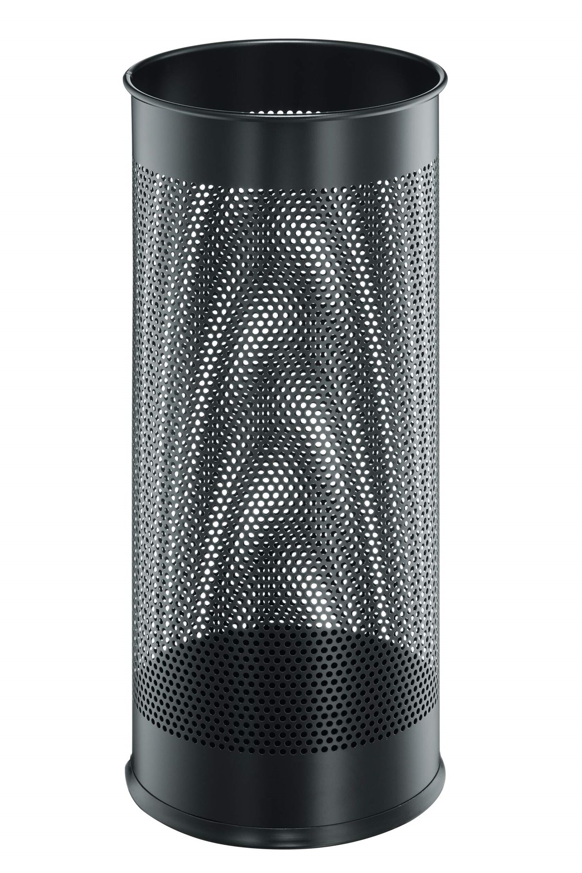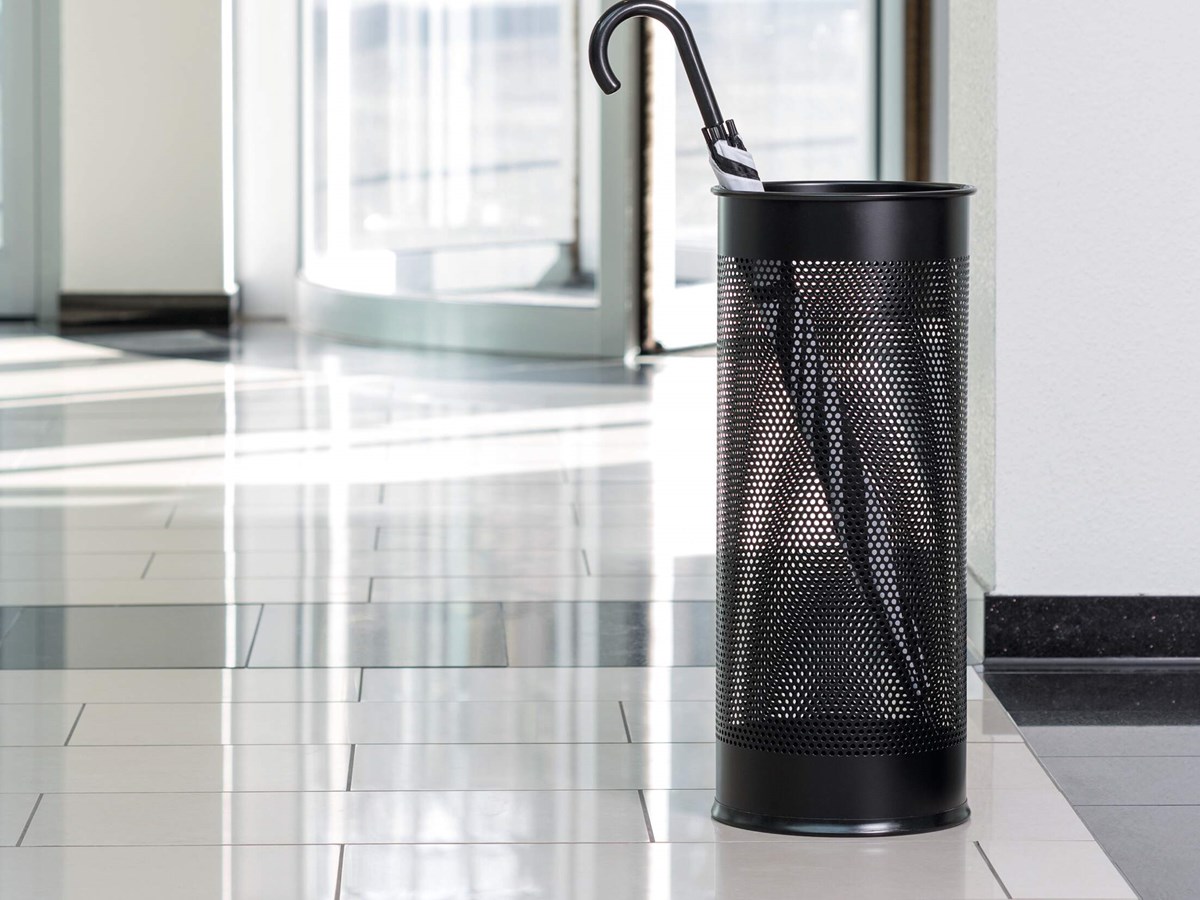 Runt paraplyställ i perforerad metall. Kan även användas som papperskorg. Antiglidskydd på undersidan som även skyddar golvet mot repor. Kapacitet: 28,5 liter. Höjd 62 cm, Ø 26 cm.