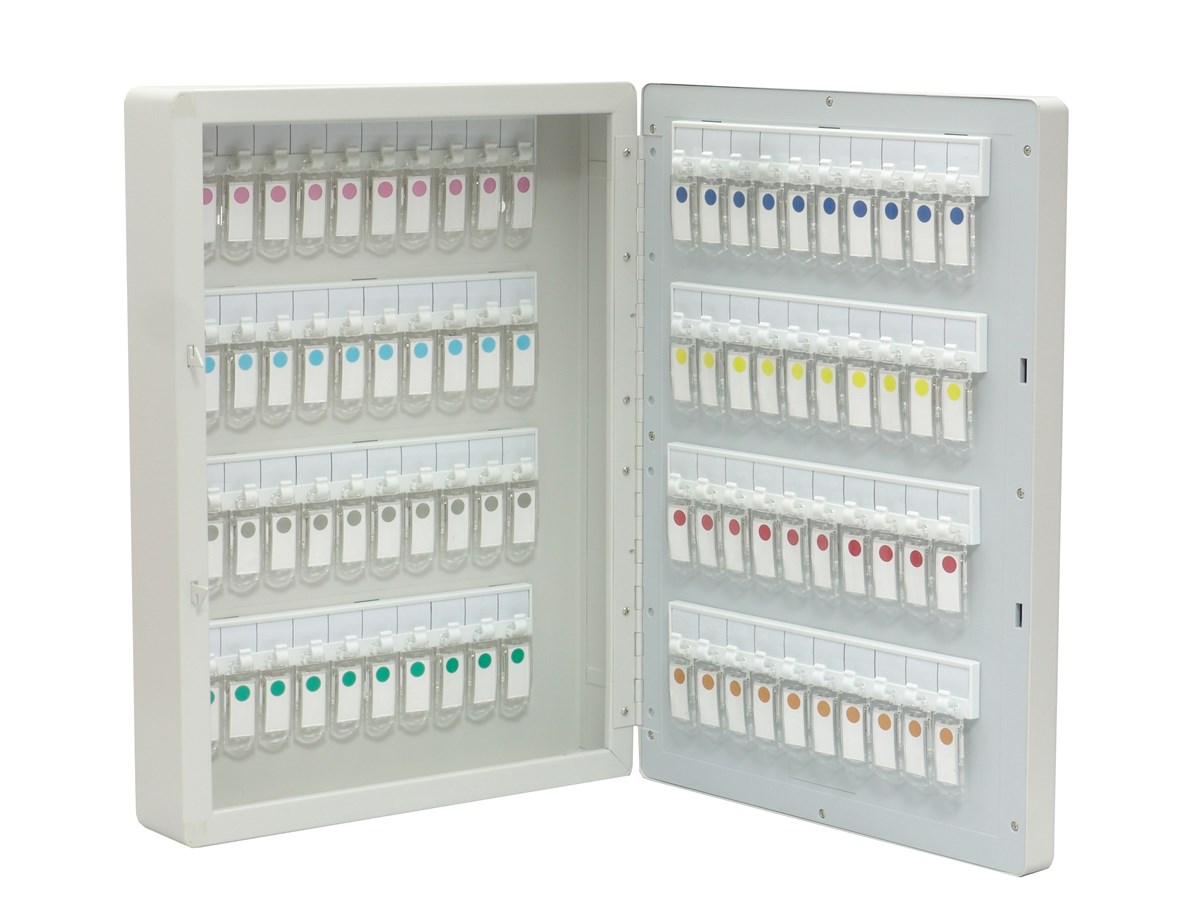Skåp av kraftig stålplåt med digitalt lås och LED-indikator. Levereras med nyckelbrickor och 2 huvudnycklar. Justerbara krokar. Möjlighet till inmatning av egen kod. För drift av lås behövs 4 st AA-batterier (ingår ej).