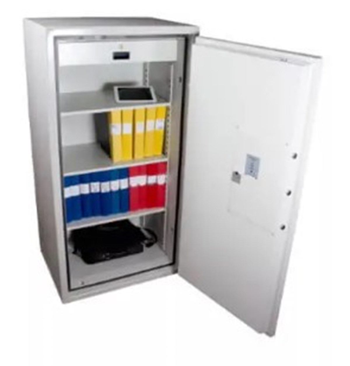 ES 400, 120P är brandsäkra dokumentskåp som skyddar papper vid brand. Skåpen är testade och godkända enligt NT Fire 017 i 120P papper. Skåpen är inredda med flyttbara hyllor för A4-pärmar samt en låsbar låda. Lådan kan lätt demonteras och då kan utrymmet nyttjas till pärmförvaring. Skåpen är som standard utrustade med elektroniskt kodlås med två utbytbara koder. Låset är borrskyddat med en sprängsäkring som låser regelverket vid inbrottsförsök. Brandklass: Brandsäkert i 120 min. Utv. mått mm: H: 1597 B: 834 D: 630 Inv. mått mm: H: 1438 B: 675 D: 463 Vikt 410kg