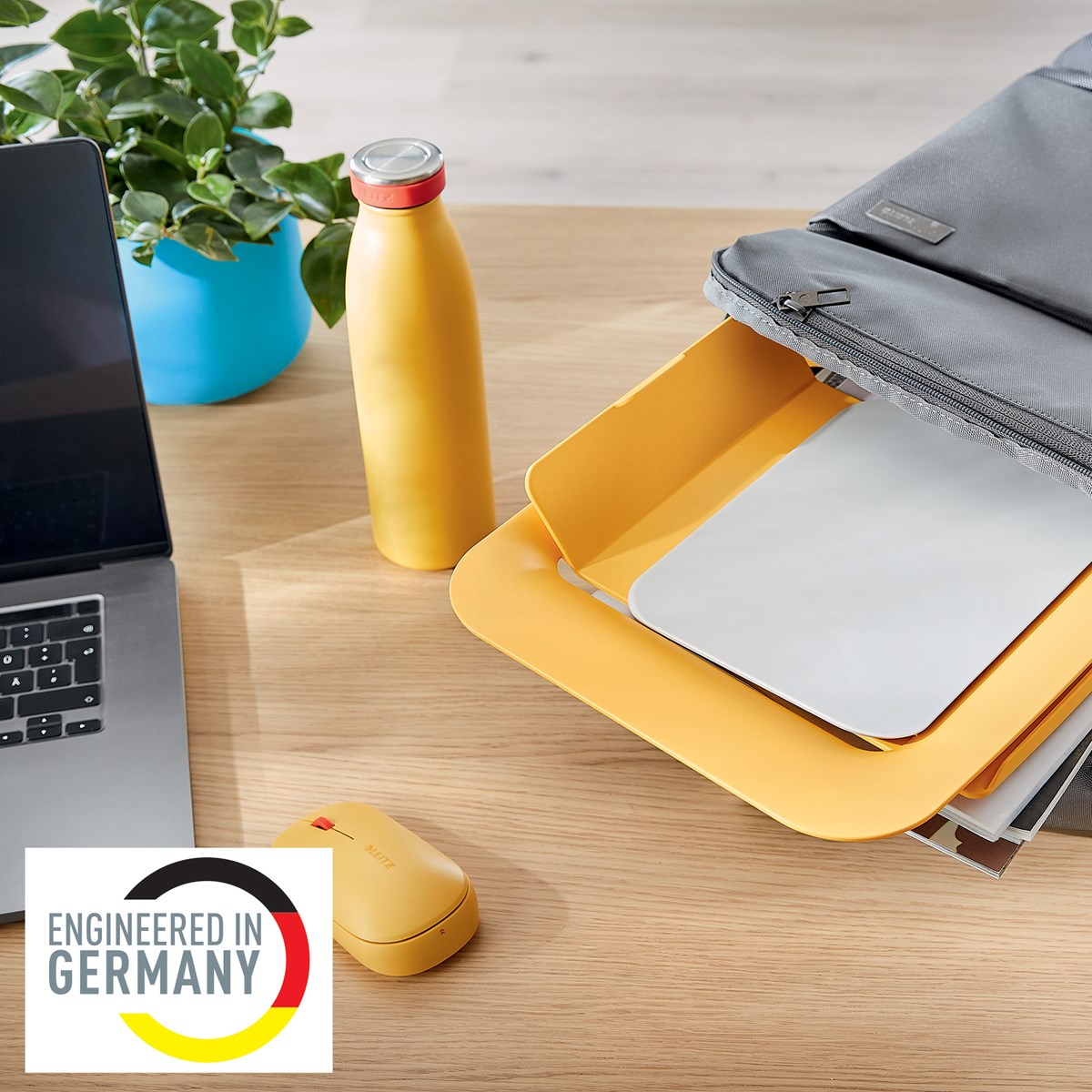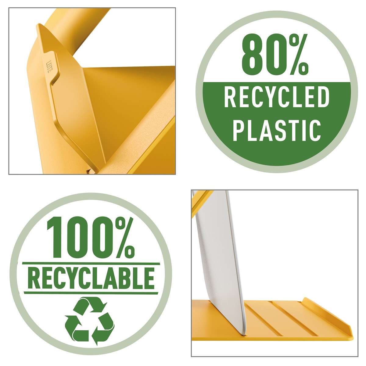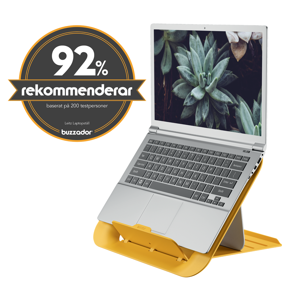 Leitz Ergo Cosy Laptopställ höjer skärmen på din bärbara dator för att öka din ögonkomfort och hjälpa till att förbättra din hållning. Tillverkad av 80% post-consumer återvunnen plast, produkten kan demonteras genom att metalldelar separeras från plast för 100% återvinning - hög kvalitet och lång livslängd för att hjälpa till att bevara jordens resurser. Att använda ett laptopställ främjar också luftflödet, vilket håller din laptops batteri och andra komponenter svala för att upprätthålla höga prestandanivåer. Med sin minimalistiska och färgglada design förbättrar det här eleganta laptopstativet både hälsa och välbefinnande genom att enkelt skapa den perfekta aktiva arbetsmiljön. Kombinera med andra Leitz Ergo-produkter för att skapa en inbjudande och flexibel arbetsplats som håller dig i rörelse hela dagen. Lämplig för bärbara datorer från 13" till 17", MacBooks som öppnas till maximalt 135 grader kan användas i höjdinställningarna 162 mm och 176 mm
