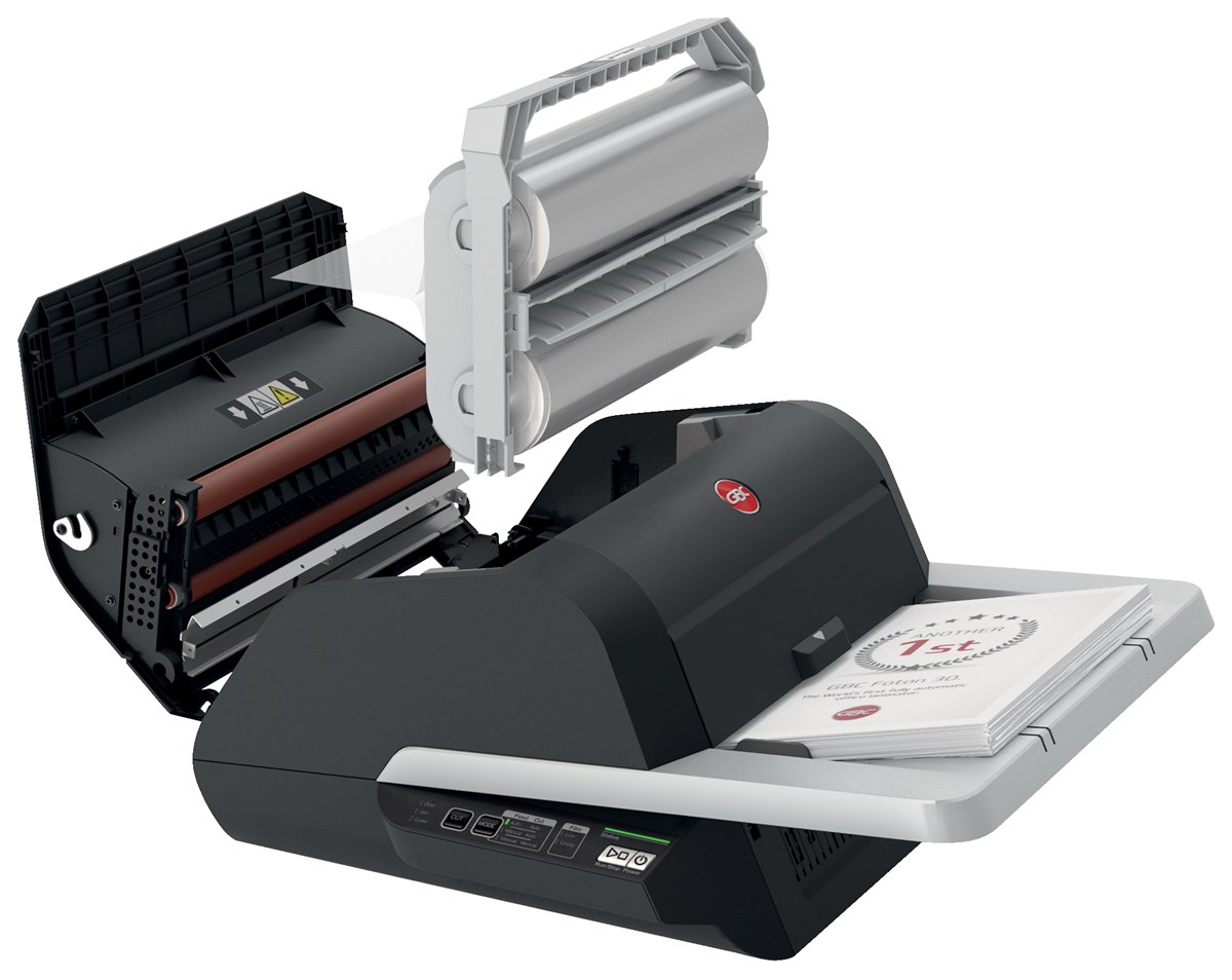 Lättladdade GBC-laminatkassetter i tre tjocklekar. Öppna locket, lyft ut och byt ut den tomma kassetten mot den nya.