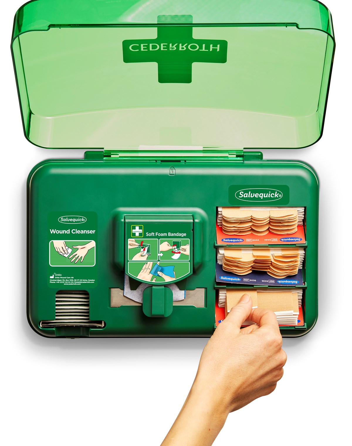 Innehåll: - Salvequick Sårtvättare, 40 st (REF 3227) - Cederroth Soft Foam Bandage Blue 4,5 m (REF 51011010) - Salvequick Textilplåster, 40 st (REF 6444) - Salvequick Plastplåster, 45 st (REF 6036) - Salvequick XL Textilplåster 21 st (REF 6470) - 1 Refillnyckel