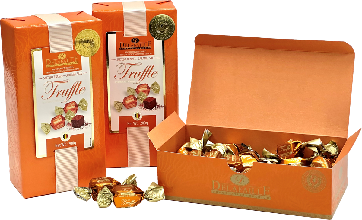 Belgiska tryfflar med smak av salt karamell inslagna i orange presentpapper.