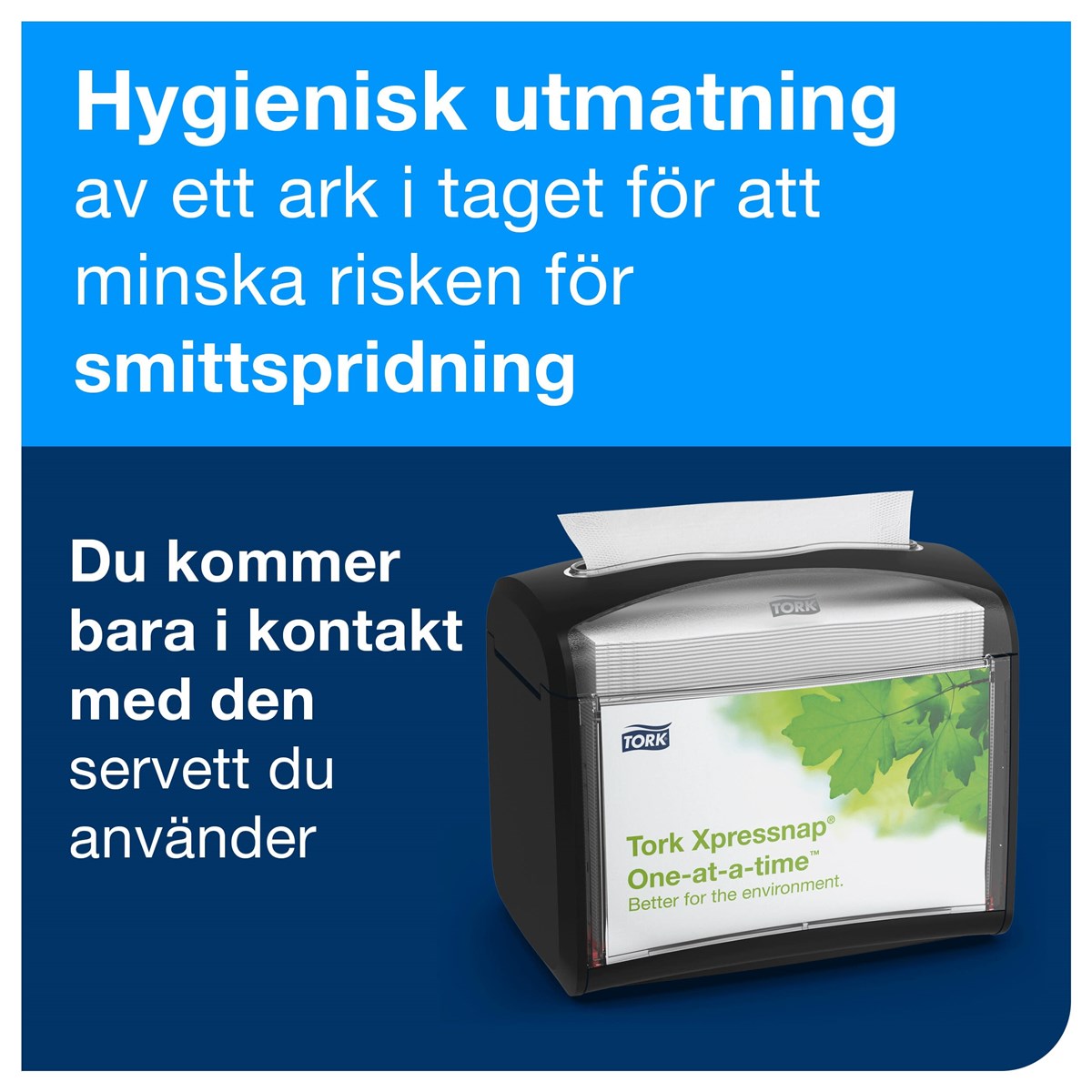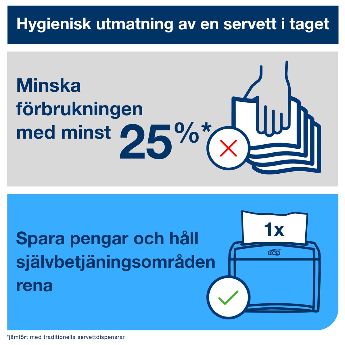 Hektiska miljöer med självservice behöver en balans mellan bekvämlighet och kvalitet – den tjocka 2-lagerskonstruktionen hos Tork Xpressnap® Extra Mjuk Dispenserservett ger dig båda två. Beställning och lagerhantering förenklas av att servetterna kan användas med alla Tork Xpressnap® Dispensrar. Det kostnadseffektiva systemet har arkvis utmatning och minskar förbrukningen med 25 % jämfört med traditionella dispensrar. Det förbättrar också hygienen då gästerna bara rör det de tar.