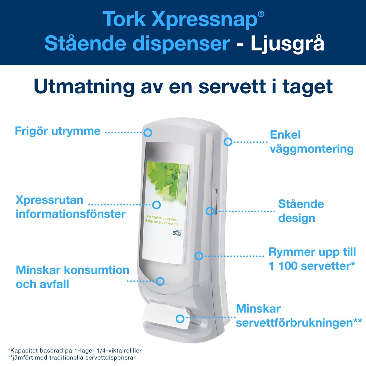Stående servettdispenser som också kan hängas på väggen. Placera eget budskap i reklamrutan. Hög kapacitet – rymmer 1100 N4-servetter. Format: H62,2 x B23,5 x D23,5 cm.