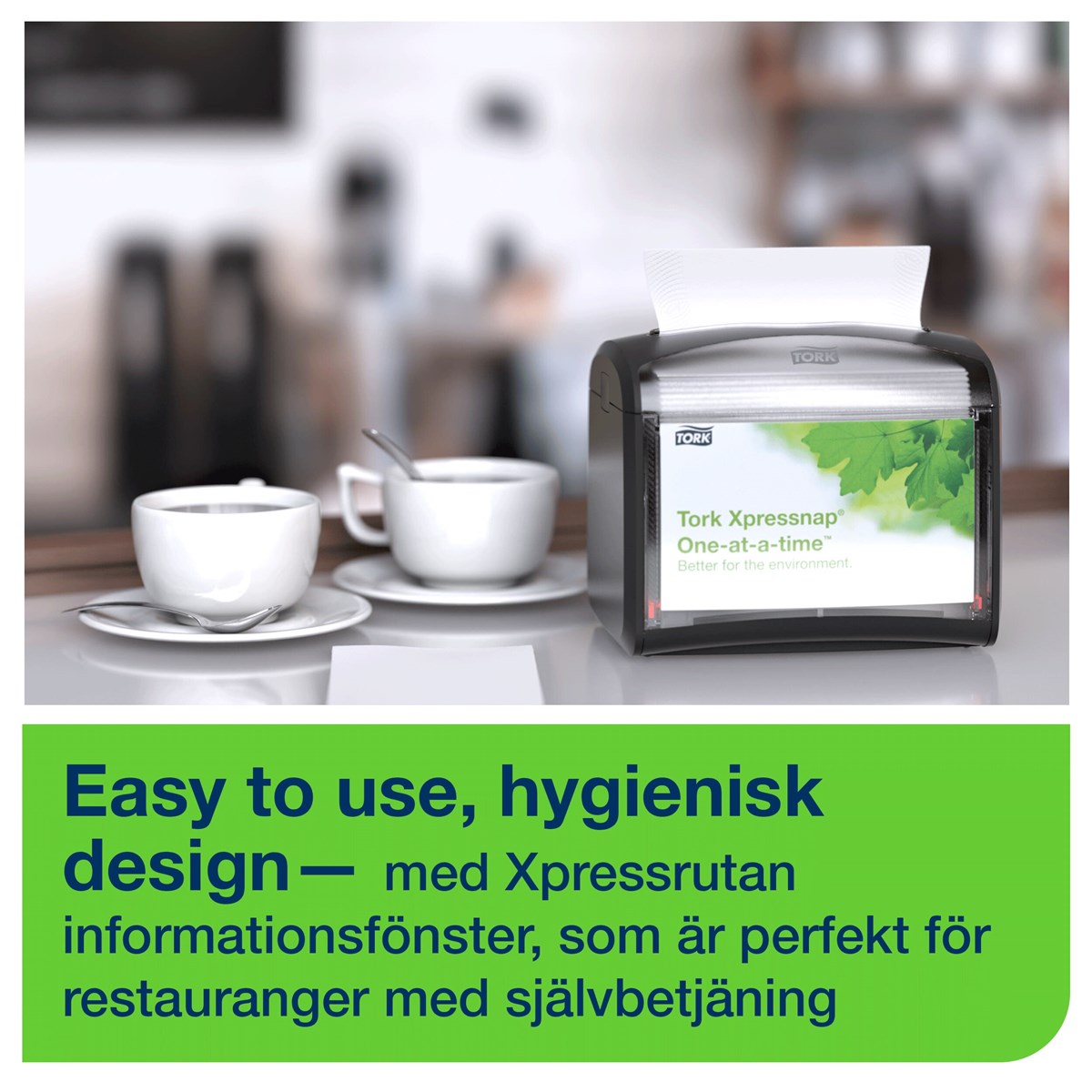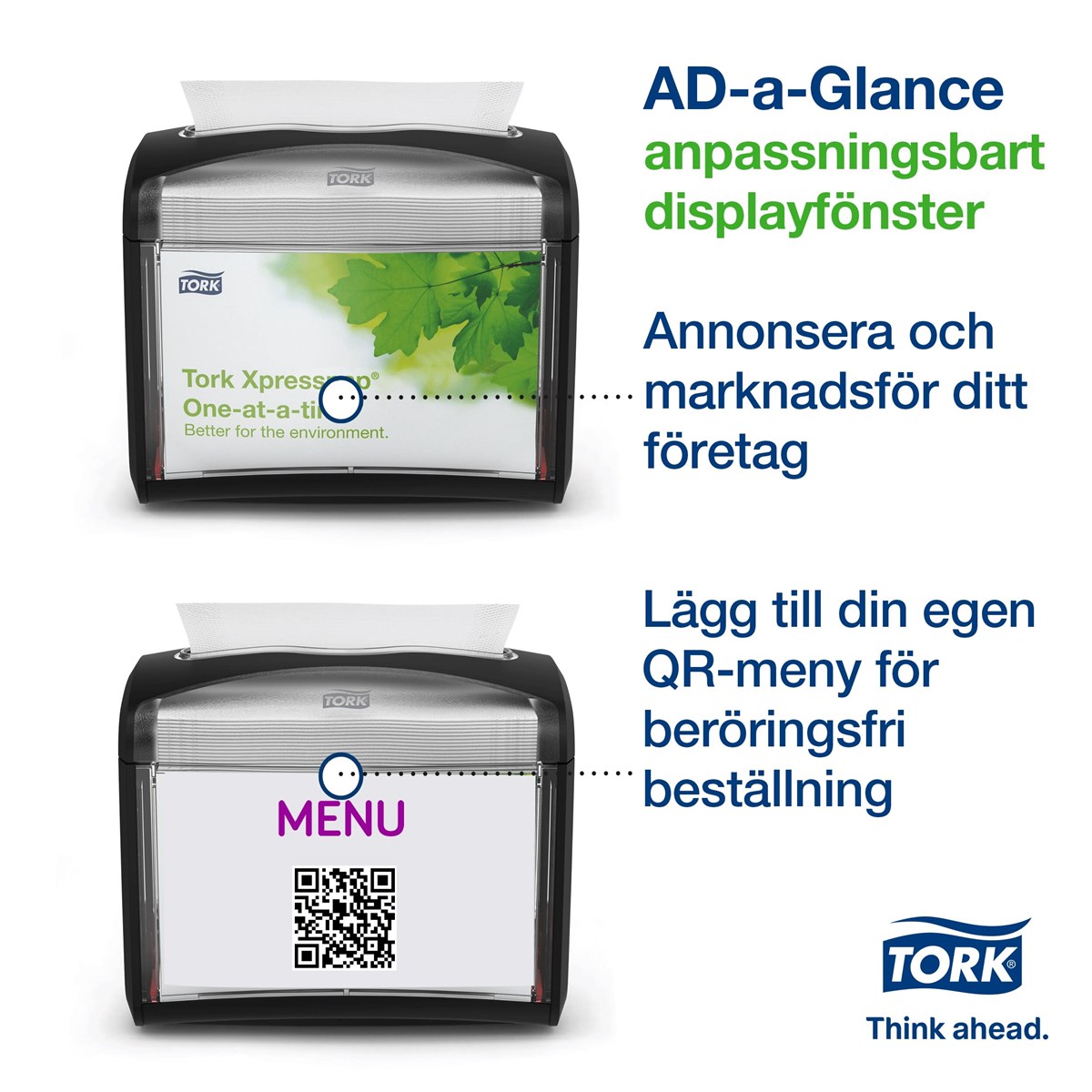 Smidig, toppmatad servettdispenser. Utmärkt för bord och diskar. Placera eget budskap i reklamrutan. Rymmer 275 st N4-servetter. Format: H15,5 x B20,1 x D14,6 cm.