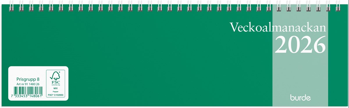 Format: 305x90 mm. Layout: Stående. Vecka/uppslag. Timindelning 8-18. Kalendarium: 2025-12-22 - 2027-01-03. Omslag: Kartong. Spiralbunden. Innehåll: Kyrkliga helgdagar, Flaggdagar, Helgdagar/aftnar, Månfaser, Namnsdagar, Temadagar/händelser, Årsöversikt/årsöversikter. Antal sidor: 56. Miljöinformation: FSC®.