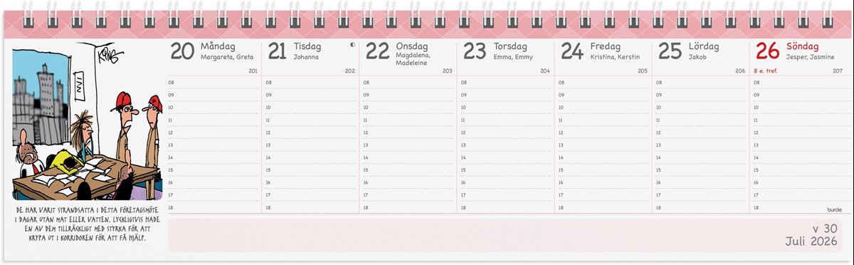 Format: 305x90 mm. Layout: Stående. Vecka/uppslag. Timindelning 8-18. Kalendarium: 2025-12-22 - 2027-01-03. Omslag: Kartong. Spiralbunden. Innehåll: Kyrkliga helgdagar, Flaggdagar, Helgdagar/aftnar, Månfaser, Namnsdagar, Temadagar/händelser, Årsöversikt/årsöversikter. Antal sidor: 56. Miljöinformation: FSC®.