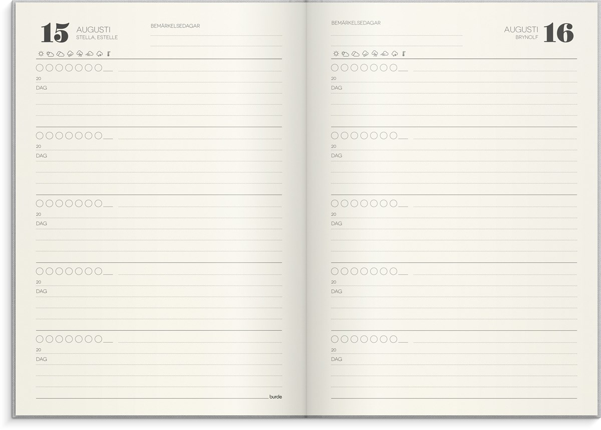 Format: 142x205 mm. Layout: Dag/sida. Omslag: Linnetextil. Inbunden. Detaljer: Märkband. Innehåll: Årsplan, namnsdagsregister. Antal sidor: 384. Pappersvikt: 100 g. Miljöinformation: FSC-papper. Varumärke: Burde.