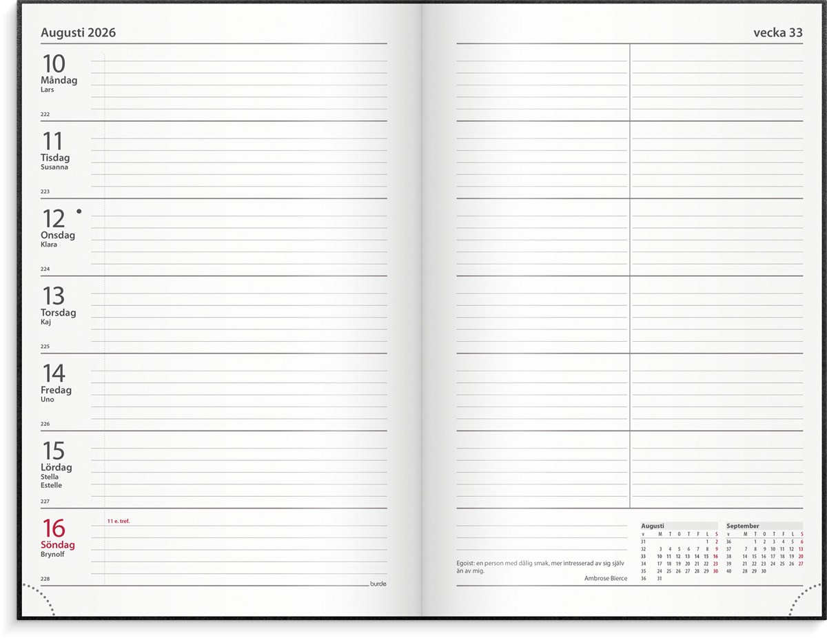 Format: 150x230 mm. Layout: Liggande. Vecka/uppslag. Kalendarium: 2025-12-22 - 2027-01-03. Omslag: Konstläder. Inbunden. Detaljer: Märkband. Innehåll: Kyrkliga helgdagar, Flaggdagar, Helgdagar/aftnar, Månfaser, Namnsdagar, Internationella helgdagar översikt, Temadagar/händelser, Årsöversikt/årsöversikter, Årsplan/årsplaner. Antal sidor: 128. Miljöinformation: FSC®.