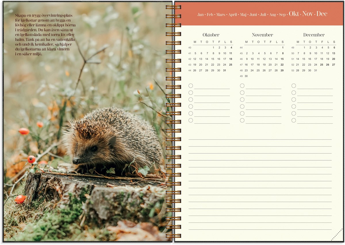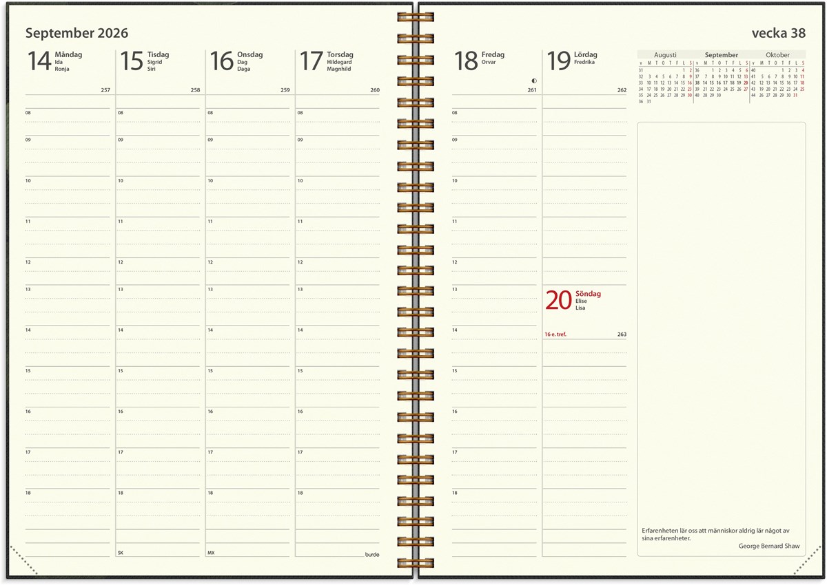 Format: A5. Layout: Stående. Vecka/uppslag. Timindelning 8-18. Kalendarium: 2025-12-01 - 2027-01-03. Omslag: Kartong med struktur. Spiralbunden. Detaljer: Gummiband. Innehåll: Kyrkliga helgdagar, Flaggdagar, Helgdagar/aftnar, Internationella helgdagar, Månfaser, Namnsdagar, Temadagar/händelser, Årsplan/årsplaner. Antal sidor: 160. Miljöinformation: FSC®.
