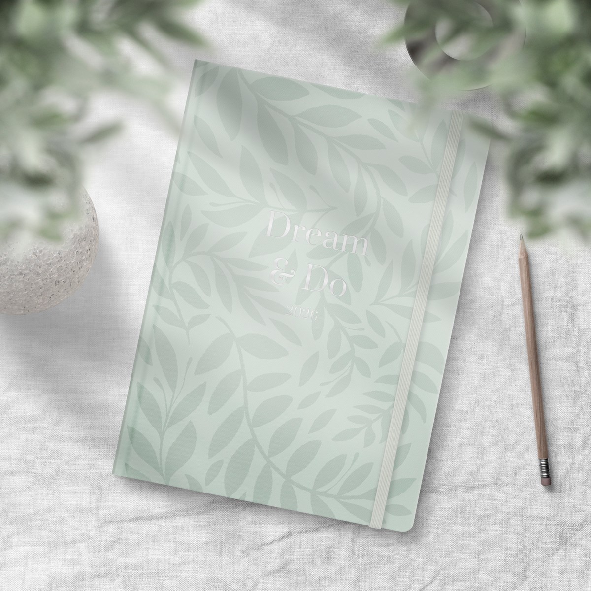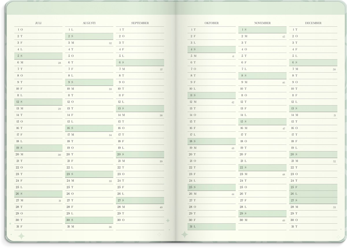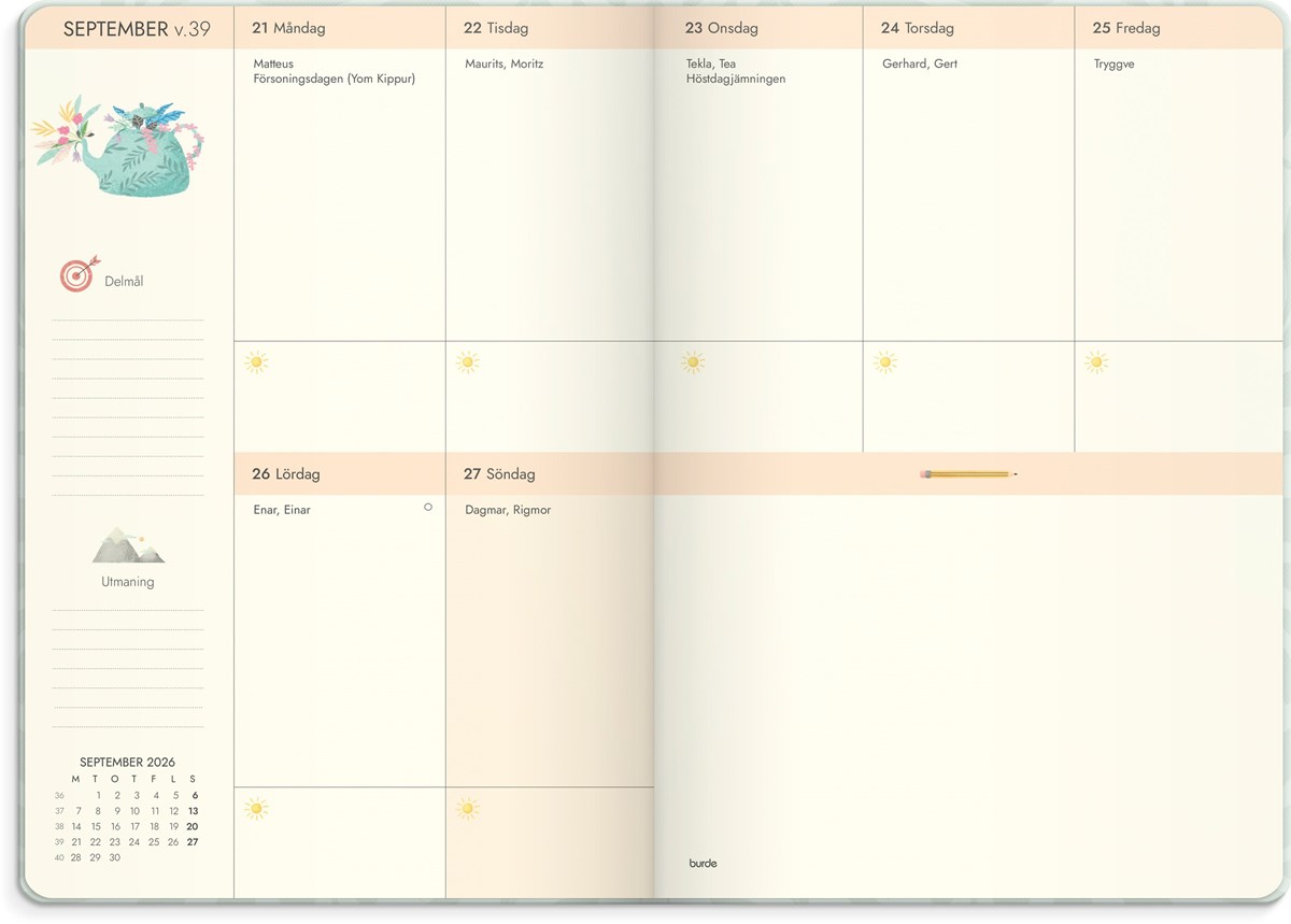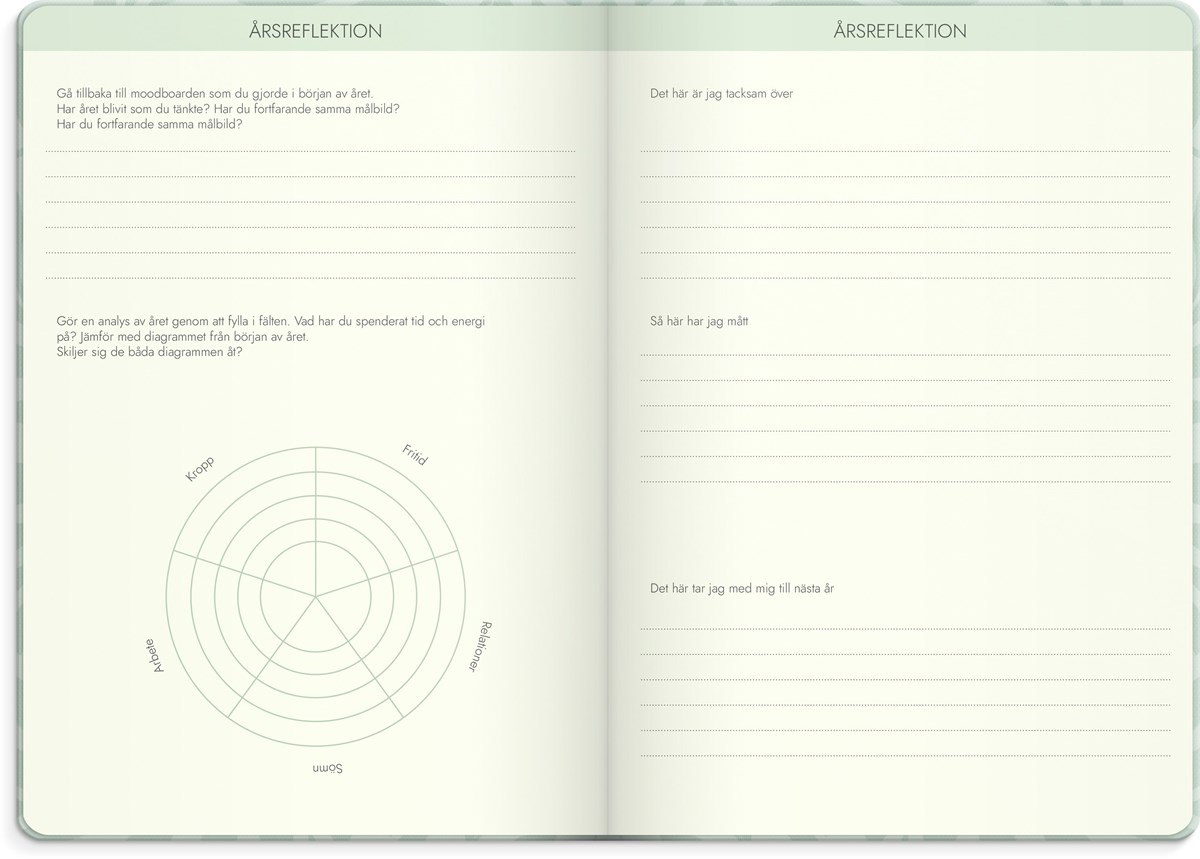 Format: 163x229 mm. Layout: Rutor. Vecka/uppslag. Kalendarium: 2025-12-08 - 2027-01-03. Omslag: Kartong med struktur. Inbunden. Detaljer: Gummiband. Märkband. Innehåll: Årsmål, Födelsedagslista, Bucketlist, Checklista, Flaggdagar, Helgdagar/aftnar, Moodboard, Månfaser, Namnsdagar, Anteckningssidor prickade, Anteckningssidor linjerade, Temadagar/händelser, Årsplan/årsplaner, Årsreflektioner. Antal sidor: 256. Miljöinformation: FSC®.
