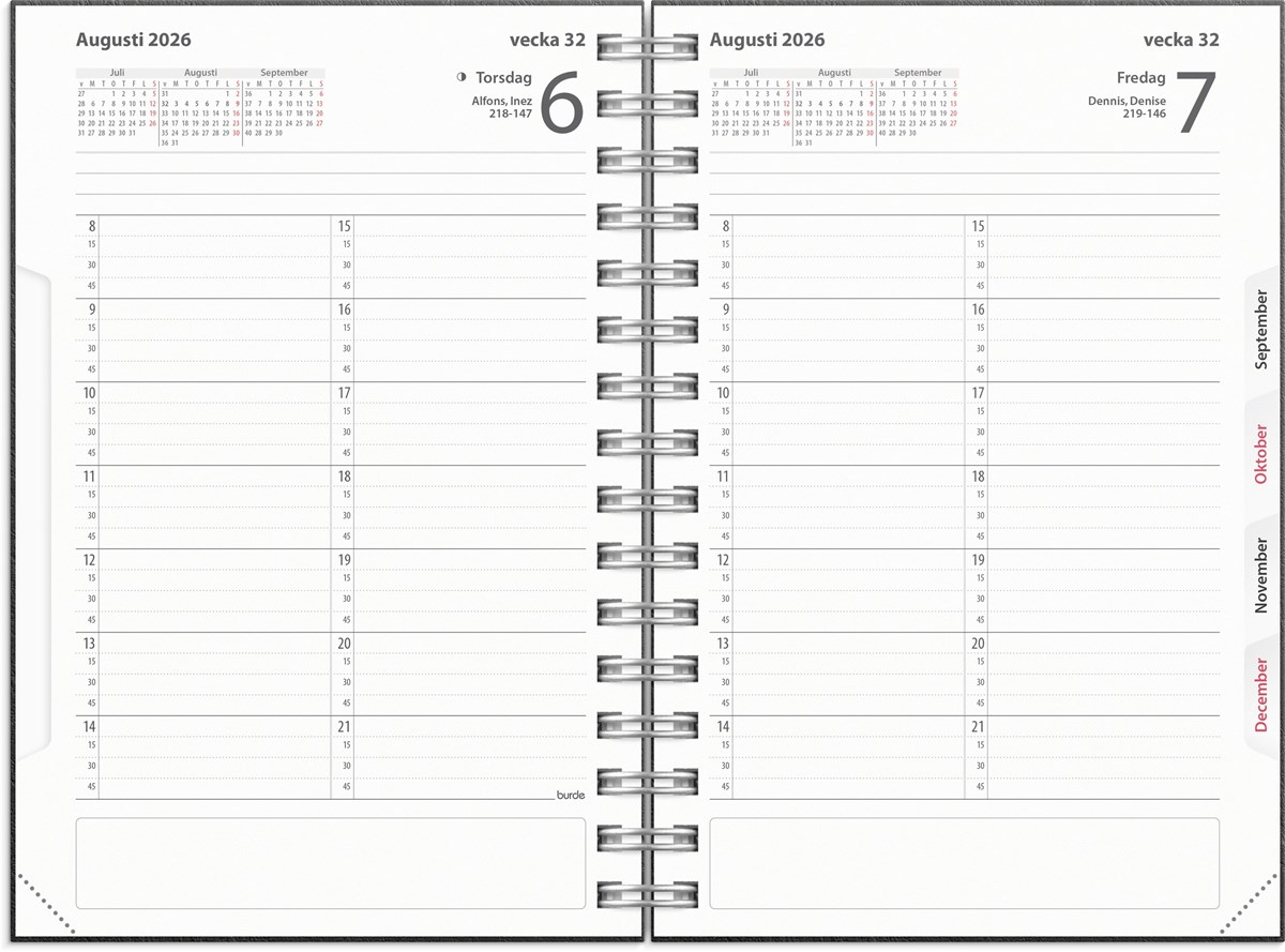 Format: 135x205 mm. Layout: Dag/sida. Kvartsindelning 8-22. Kalendarium: 2026-01-01 - 2026-12-31. Omslag: Kartong. Spiralbunden. Innehåll: Kyrkliga helgdagar, Flaggdagar, Helgdagar/aftnar, Månfaser, Namnsdagar, Internationella helgdagar översikt, Urstansat månadsregister, Temadagar/händelser, Årsöversikt/årsöversikter, Årsplan/årsplaner. Antal sidor: 400. Miljöinformation: FSC®.