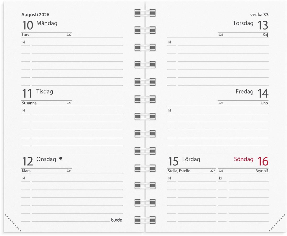 Format: 63x107 mm. Layout: Liggande. Vecka/uppslag. Kalendarium: 2025-11-10 - 2027-01-03. Omslag: Kartong. Spiralbunden. Innehåll: Flaggdagar, Helgdagar/aftnar, Månfaser, Namnsdagar, Internationella helgdagar översikt, Temadagar/händelser, Årsöversikt/årsöversikter. Antal sidor: 128. Miljöinformation: FSC®.