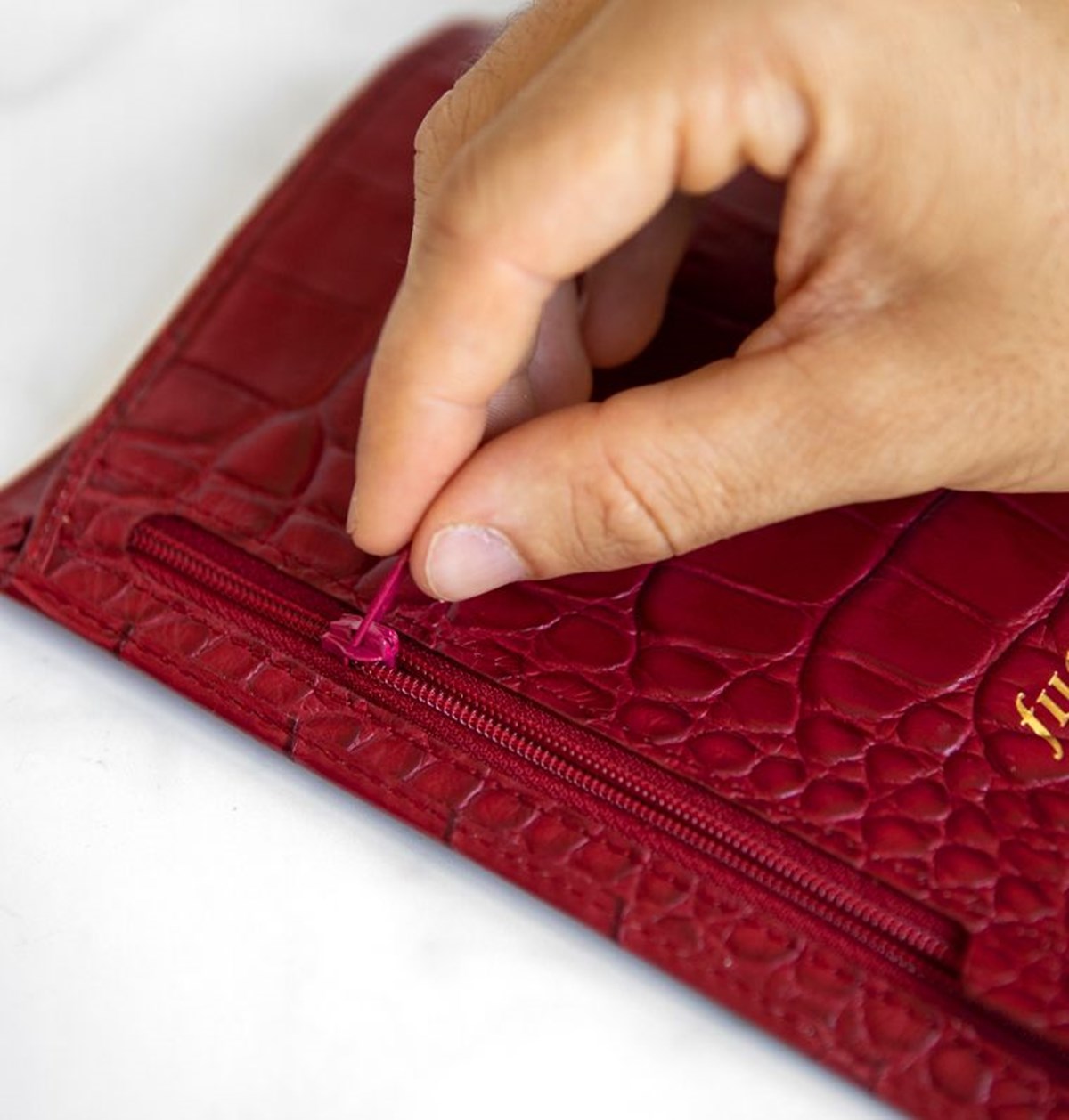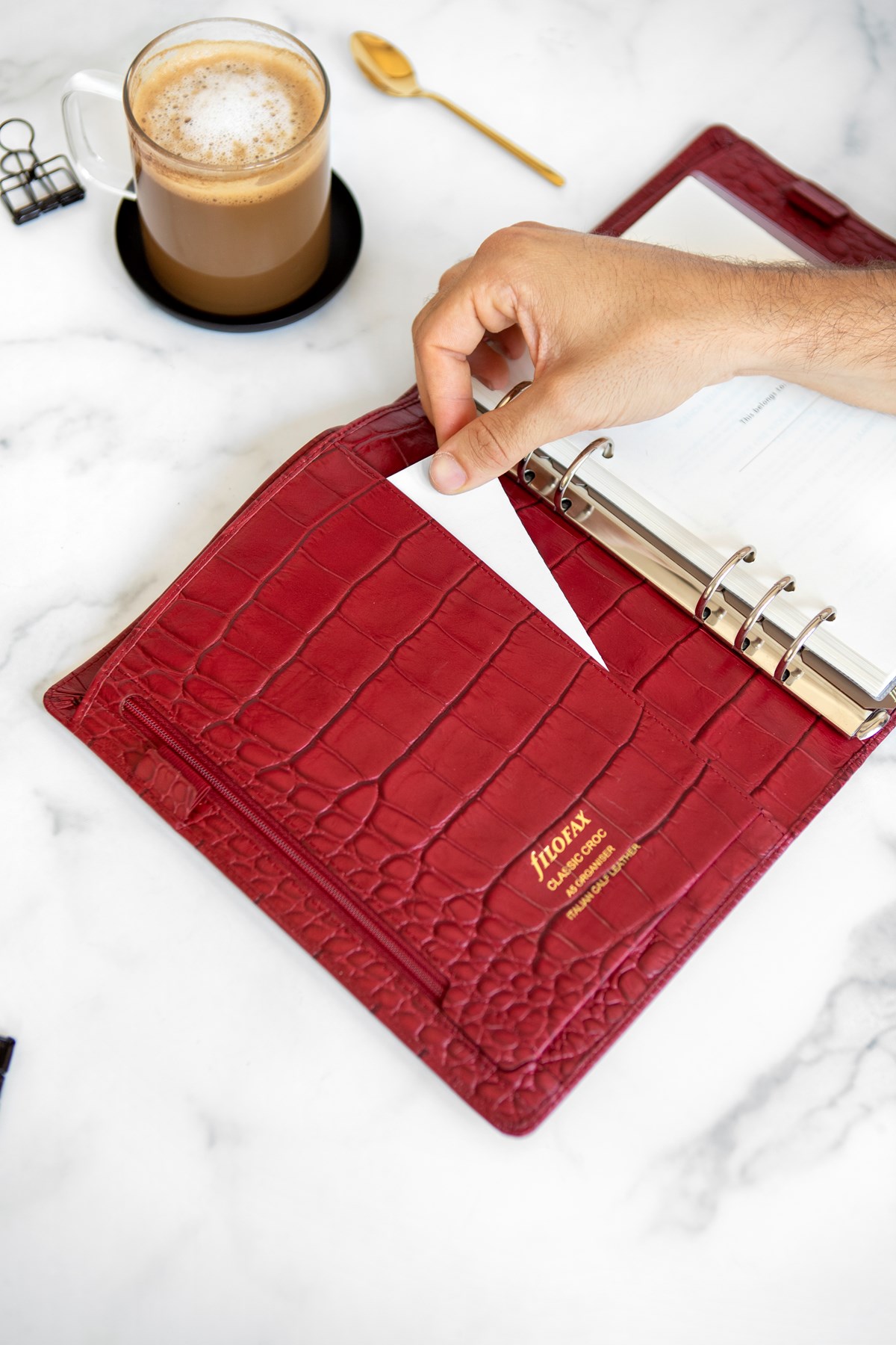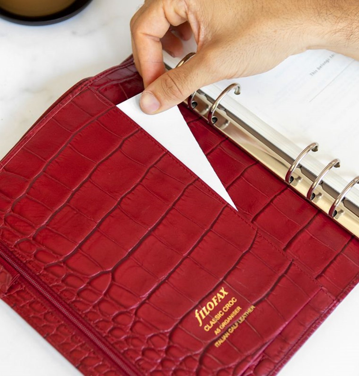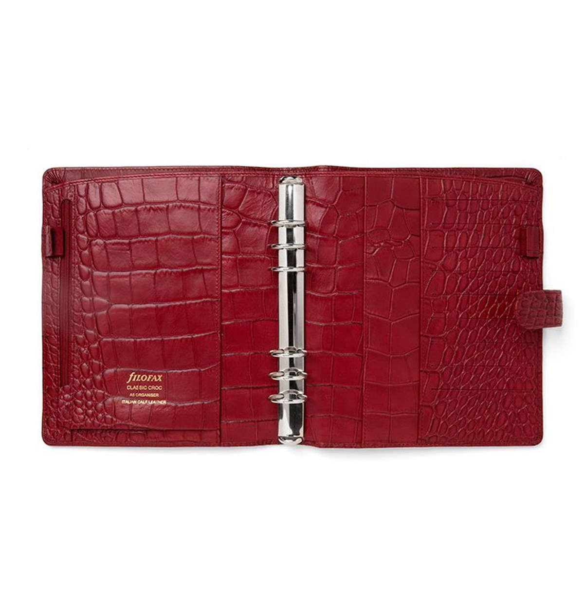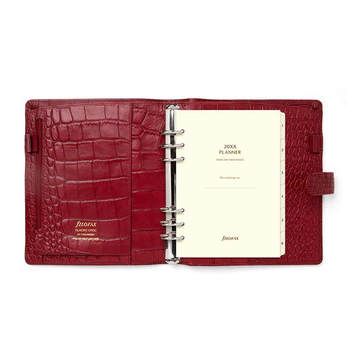 Härligt mjuk pärm tillverkad av lyxigt italienskt kalvskinn med krokodilmönster. Rustad med stor ficka för lagring av större anteckningar. Dagbok vecka per uppslag, linjal/sidomarkör, att göra lista, kontakter, index, vit anteckningsblock, färgad anteckningsblock.