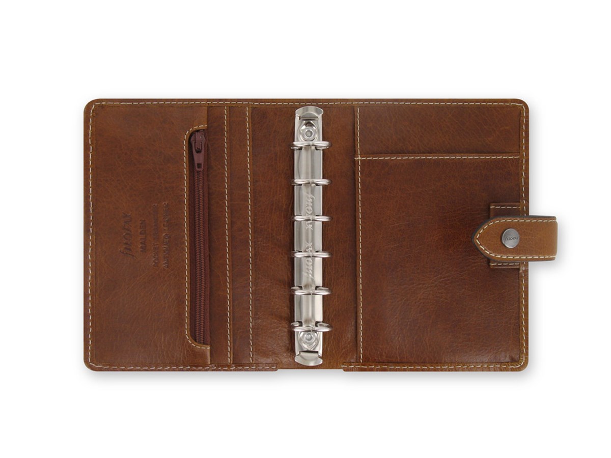 Malden systemkalender i ett delikat premiumläder. Rustik, men ändå mjuk och följsam med kraftig dekorsöm och slejp. Praktisk ficka med dragkedja på insidan. 19 mm ringmekanism. Pappersstorlek: 81x120 mm. Pärmstorlek: 148x128x40 mm.