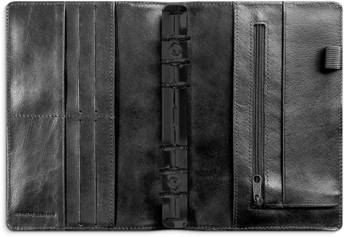 Systemkalender med grundsats. Grundsatsen innehåller hålad kalenderdel (4601) och blankettdel. Pärmen har ringmekanism (Ø 20 mm), se kreditkortsfickor, myntficka, fack för kvitton o dyl och pennhållare. Format pärm: 135x195 mm.
