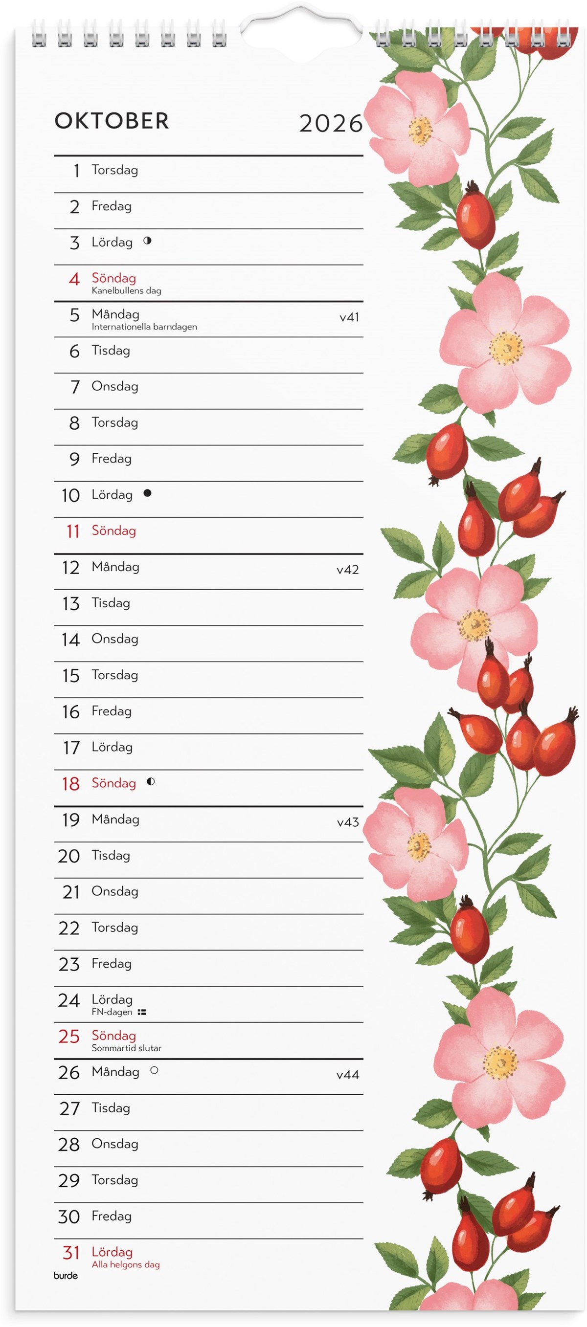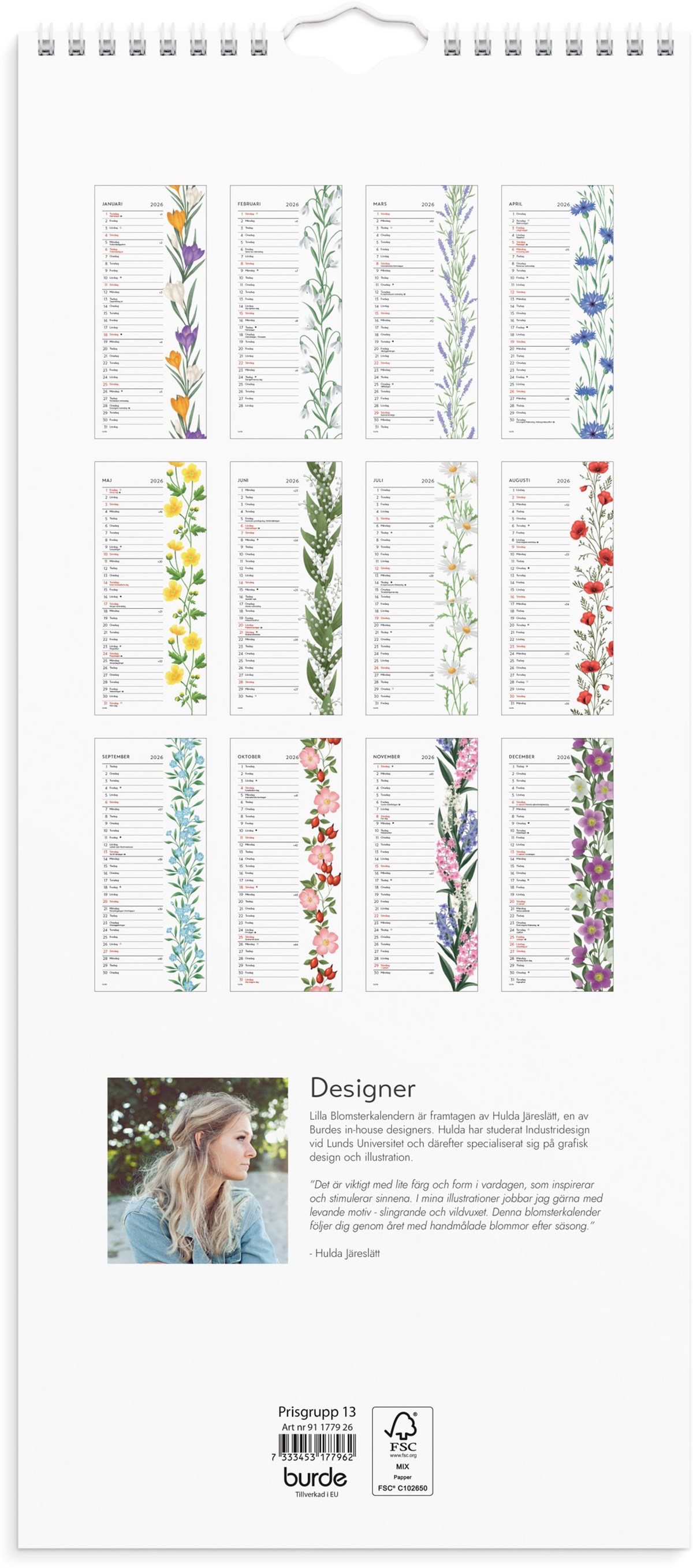 Format: 190x430 mm. Layout: Månad/blad. Kalendarium: 2026-01-01 - 2026-12-31. Spiralbunden. Innehåll: Flaggdagar, Helgdagar/aftnar, Månfaser, Namnsdagsregister, Temadagar/händelser. Antal sidor: 12. Miljöinformation: FSC®.