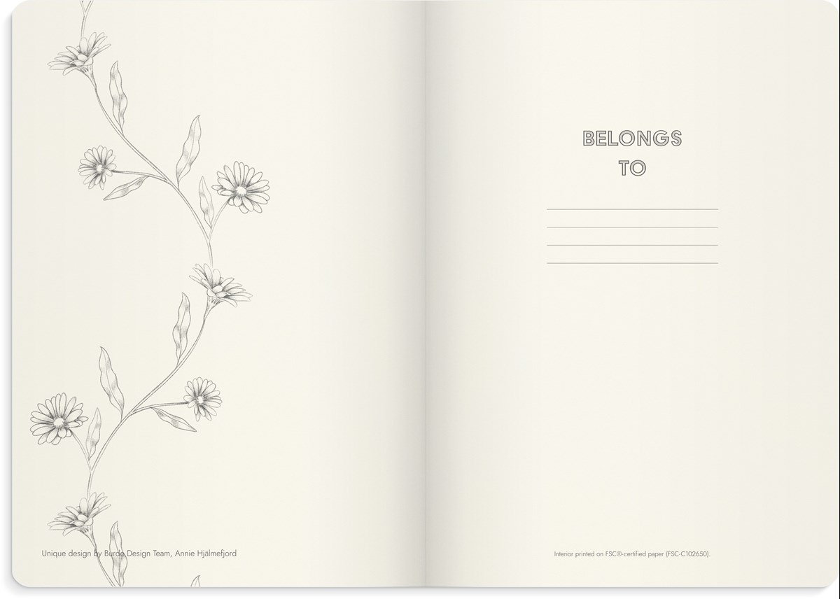 Med en enkel design för storslagna noteringar. Denna eleganta anteckningsbok ger dig den perfekta platsen att samla dina drömmar, idéer och noteringar. Anteckningsbok Notebook Deluxe har ett mjukt omslag i konstläder och ligger plant på ytan när den är uppslagen, vilket underlättar anteckningsförandet. Inlagan består av 160 sidor cremefärgat linjerat papper som bara väntar på att fyllas med notiser. Anteckningsboken har ett praktiskt gummiband som håller boken försluten när den inte används. Längst bak finns en pappersficka perfekt för att förvara extra lappar eller annat smått och gott. Anteckningsbok Notebook Deluxe kommer i ett brett sortiment av olika färger och mönster för att just du ska hitta din favorit. Skissade blommor och fjärilar omsluter Anteckningsbok Notebook Deluxe i detta Butterfly omslag med en dämpad färgpalett för den som letar efter någonting mer blygsamt.
