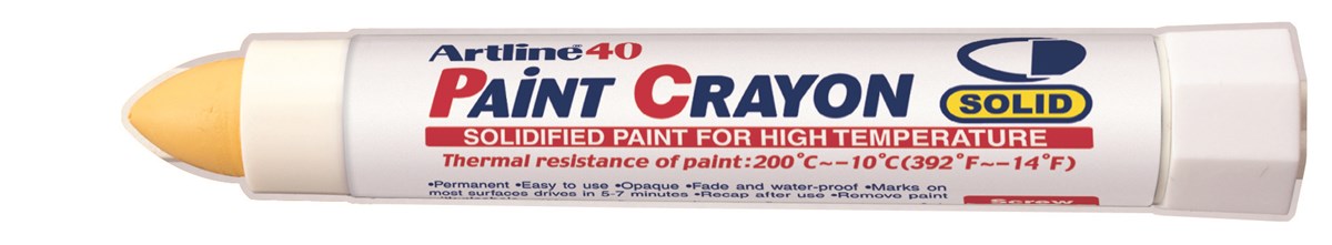 Pastapenna med kraftigt täckande färg. Permanent, färgbeständig och vattenfast. Lätt att använda. Skriver i värme upp till 200 grader och i kyla ner till -10 grader. För märkning på de flesta underlag. Torkar på 5–7 minuter. Fungerar även på ljusa, mörka, smutsiga och feta ytor. Ljusäkta, tål nötning och är väderbeständig. 12 st/förp.