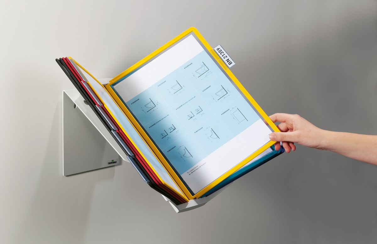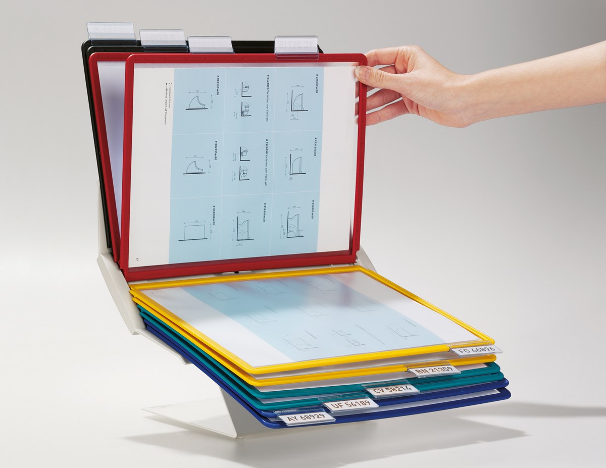 Multifunktionsställ av metall som kan användas som bordsställ eller väggställ i A4 stående och liggande format. Levereras komplett med 10 paneler (svart, röd, gul, grön och mörkblå) och rubrikhållare (58 mm). 5 års garanti.
