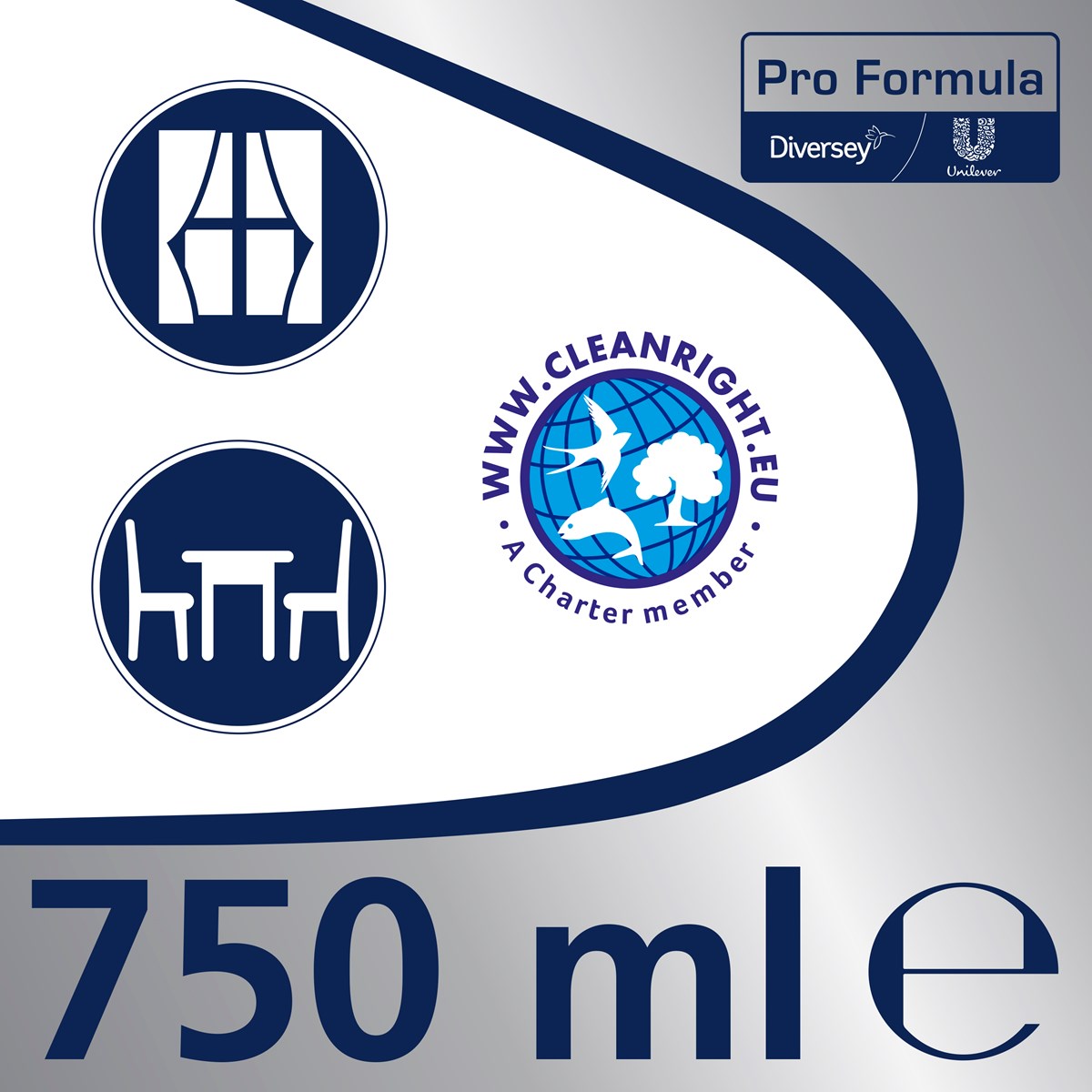 Cif Professional Glas & Multi tar snabbt bort smuts samt fettfläckar och efterlämnar en skinande blank yta på några sekunder. Produkten används outspädd på glas och interiör som till exempel speglar, bord och andra vattentåliga ytor.