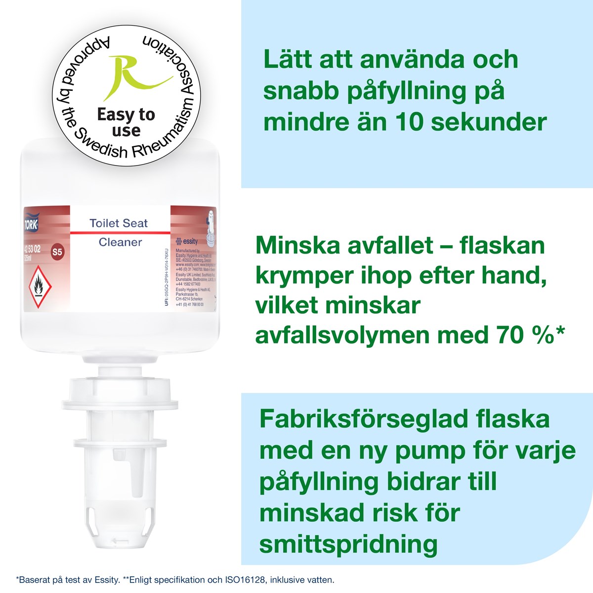 - Snabb påfyllning på mindre än 10 sekunder - Fabriksförseglad flaska med en ny pump för varje påfyllning bidrar till att minska risken för smittspridning - Flaskan krymper ihop efter hand, vilket minskar avfallsvolymen med 70 % (baserat på test av Essity)