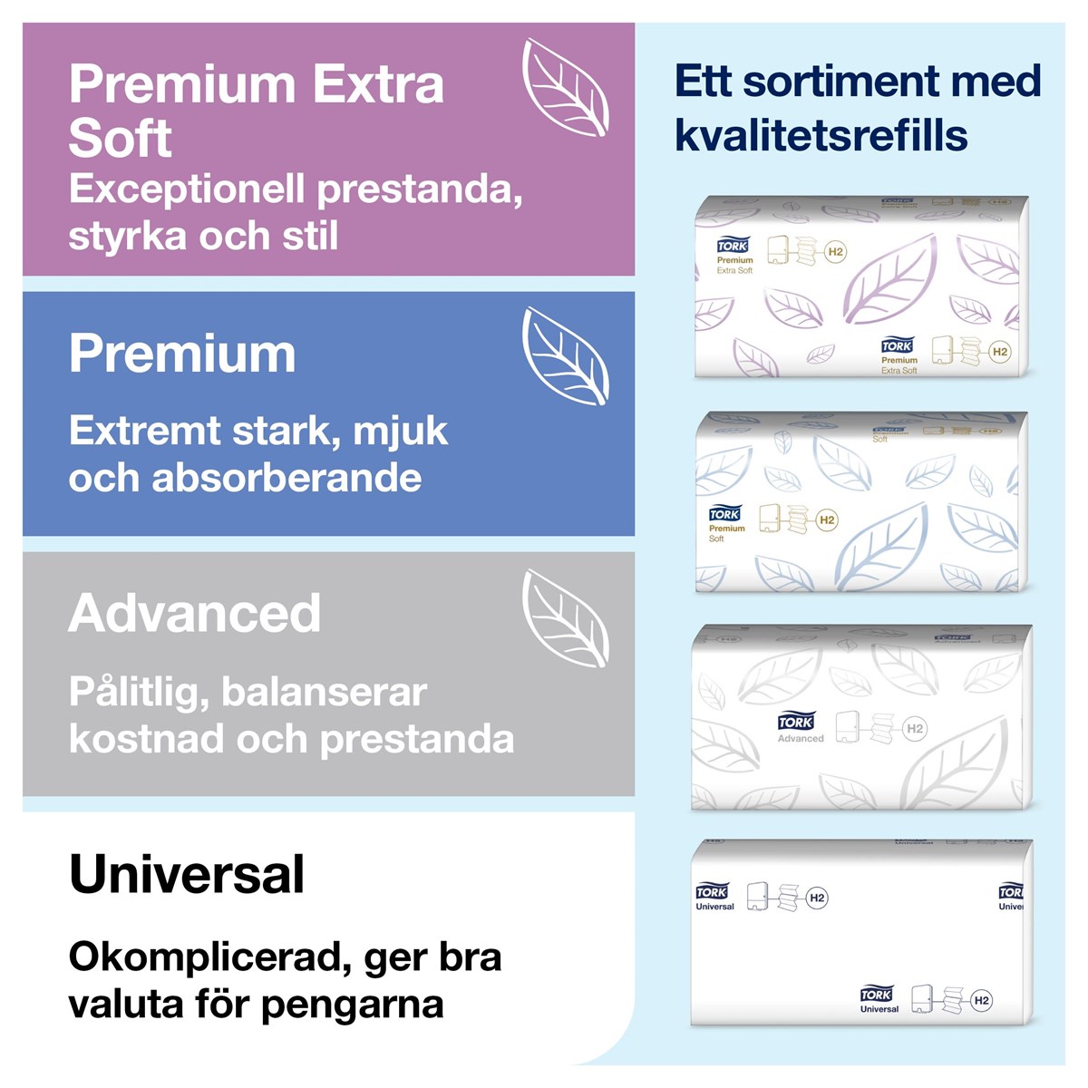 Hygienisk utmatning av en handduk i taget Enkel påfyllning, enkelt underhåll För toalettutrymmen med låg och medelhög besöksfrekvens Förborrat borrhål för enkel väggmontering Håller max 2,5 buntar