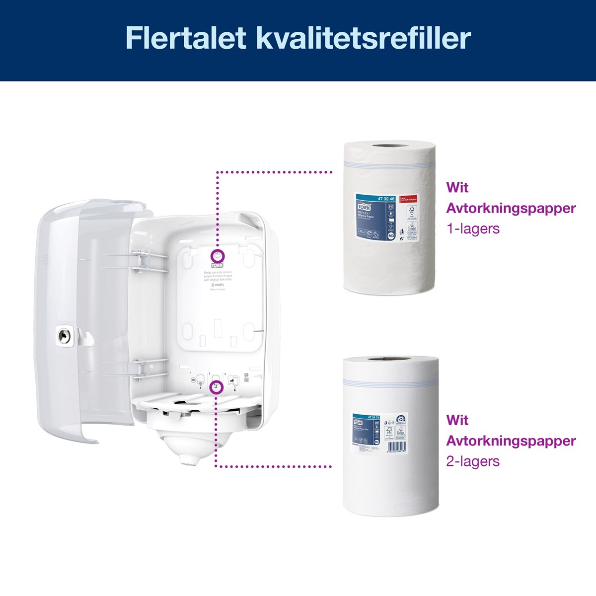 Minskar korskontaminering då användare endast vidrör det som de själva använder Hållbar, kompakt lösning som sparar plats Ekonomiskt arkmatningssystem Tork slutindikator möjliggör effektiv påfyllning