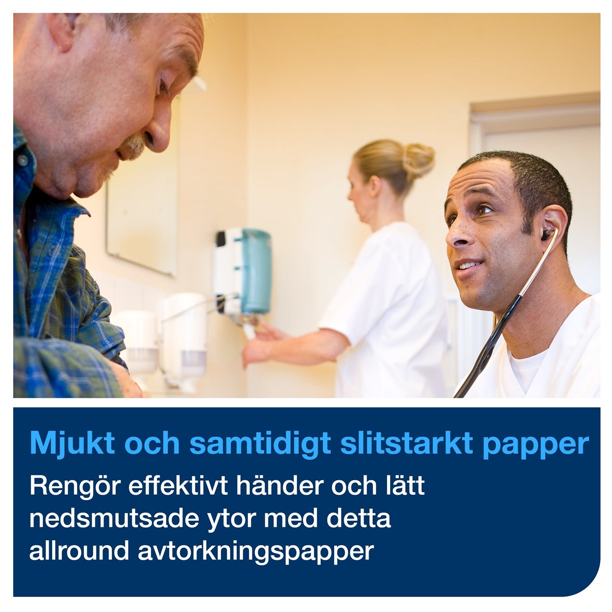 Avtorkningspapper i allround-kvalitet som minskar avfallet Rengör effektivt lätt smutsade ytor och händer Obegränsad utmatning gör att användare kan ta vad de behöver Enkel att använda med en hand Tork slutindikator hjälper till att planera byten av rullar