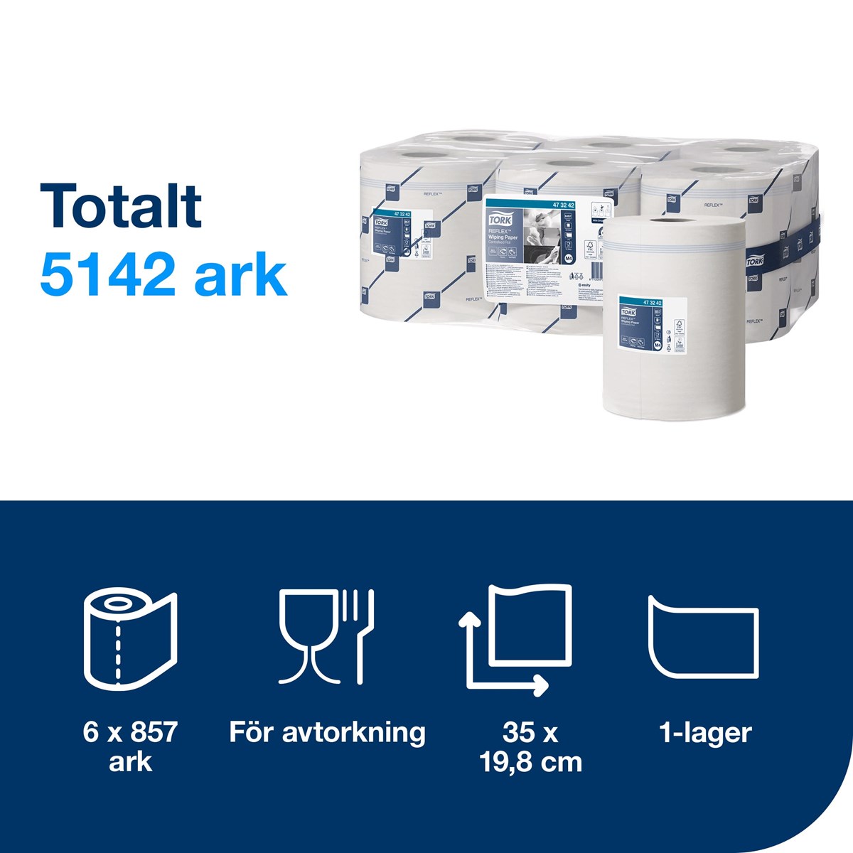 Tork Reflex® Avtorkningspapper är ett 1-lagerspapper vars styrka och höga absorptionsförmåga gör att det passar perfekt för både avtorkning och för att torka händerna. Detta papper kan användas i Tork Reflex® Centrummatad dispenser som matar ut ett ark i taget och passar ditt teams arbetsflöde, minskar åtgången och minimerar risken för smittspridning. Speciellt lämpligt för rengöring av glas – lämnar inte något ludd eller några ränder på ytan.