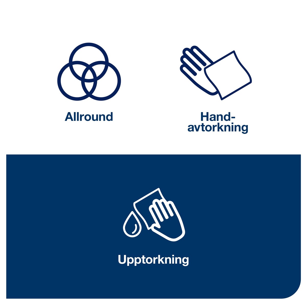 Allround-kvalitet för vätskespill och handavtorkning Förbättrar hygienen genom att du endast vidrör det papper du tar Godkänd för livsmedelskontakt Utmatning av ett ark i taget för minskad förbrukning Slutindikator försäkrar att du aldrig får slut på papper