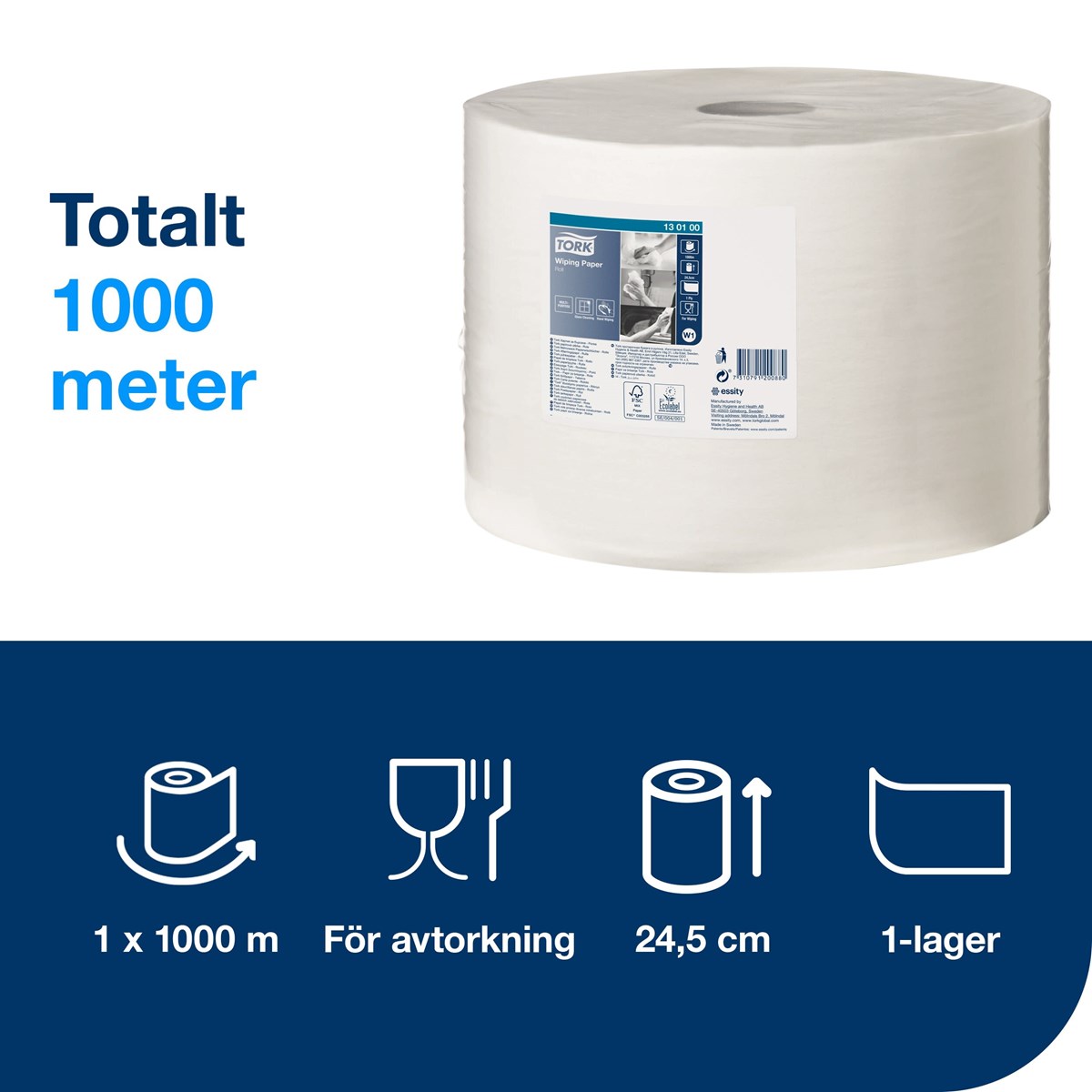 Vitt 1-lags allroundpapper för lättare avtorkning och för handavtorkning. Godkänt för livsmedelskontakt. Bredd 24,5 cm, längd 1000 m. 6,5 kg/rulle.