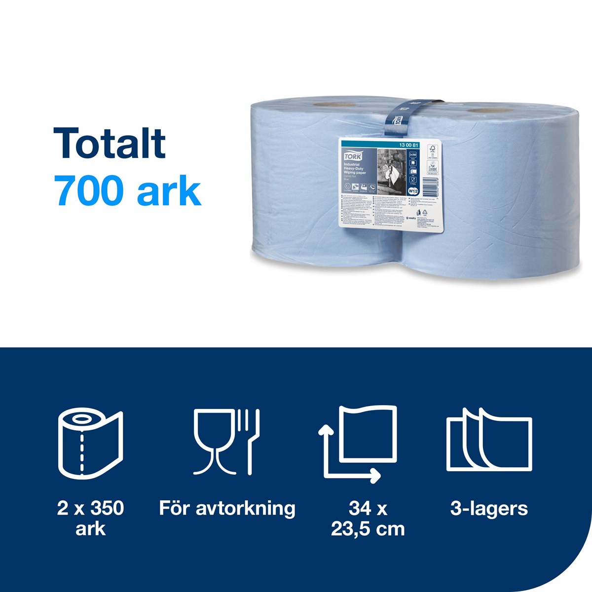 Vårt mest slitstarka papper. Blått, 3-lags. Skyddar händerna mot värme och smuts och har extra bra absorptionsförmåga. Godkänd för kontakt med livsmedel. Bredd 23,5 cm, längd 119 m. 350 ark. 1,7 kg. 2 rullar/förp.