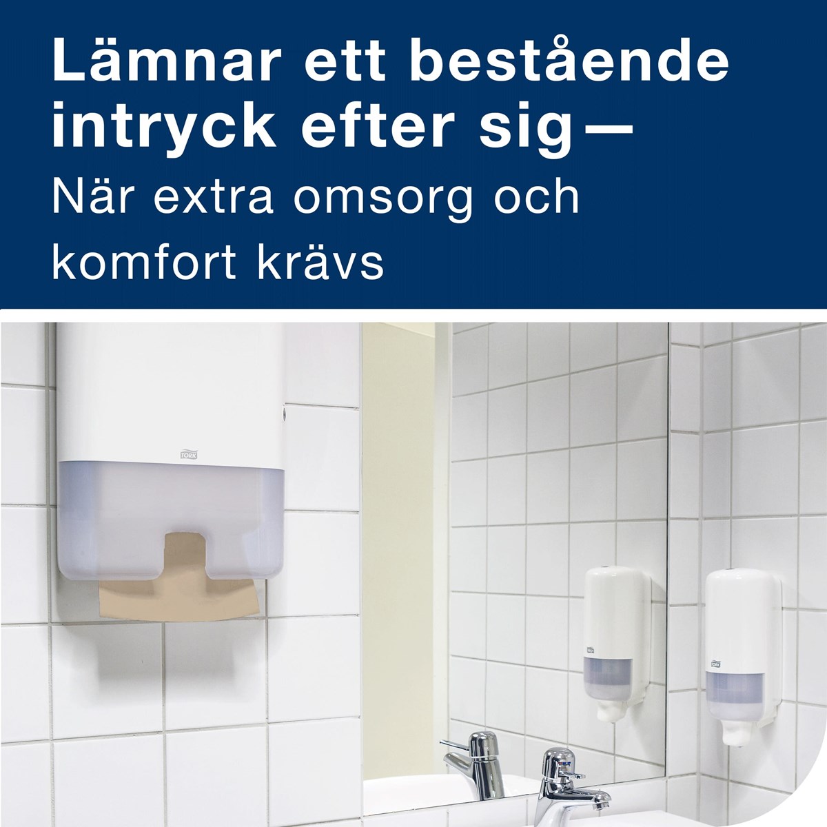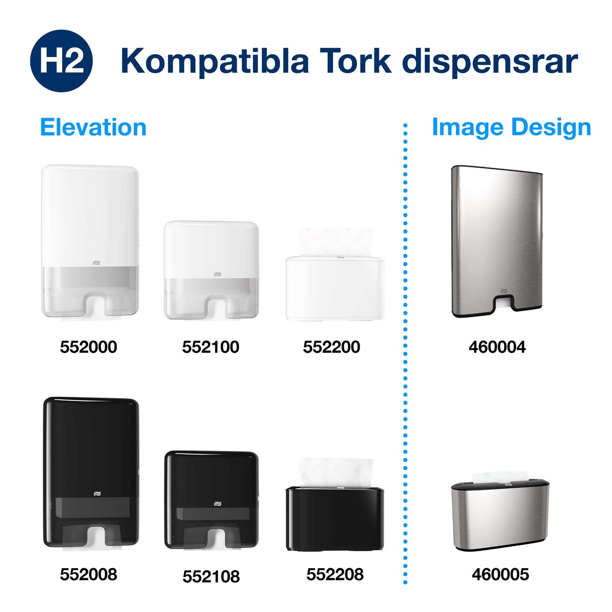 Handdukarna är skonsamma mot huden och förmedlar en känsla av hög kvalitet. Den ljusbruna färgen kommer från fibrer av återvunna kartonger. Inga färgämnen tillsätts vid tillverkningen. Kompatibel med Tork H2-dispensrar. Lämpliga för toalettutrymmen med medelhög besöksfrekvens. Dispensern får plats i små utrymmen och erbjuder dina gäster både komfort och hygien. Pappret tillverkas av 100 % återvunna fibrer. Mått: 24x21,3 cm. 180 st/bunt, 3780 st/förp.
