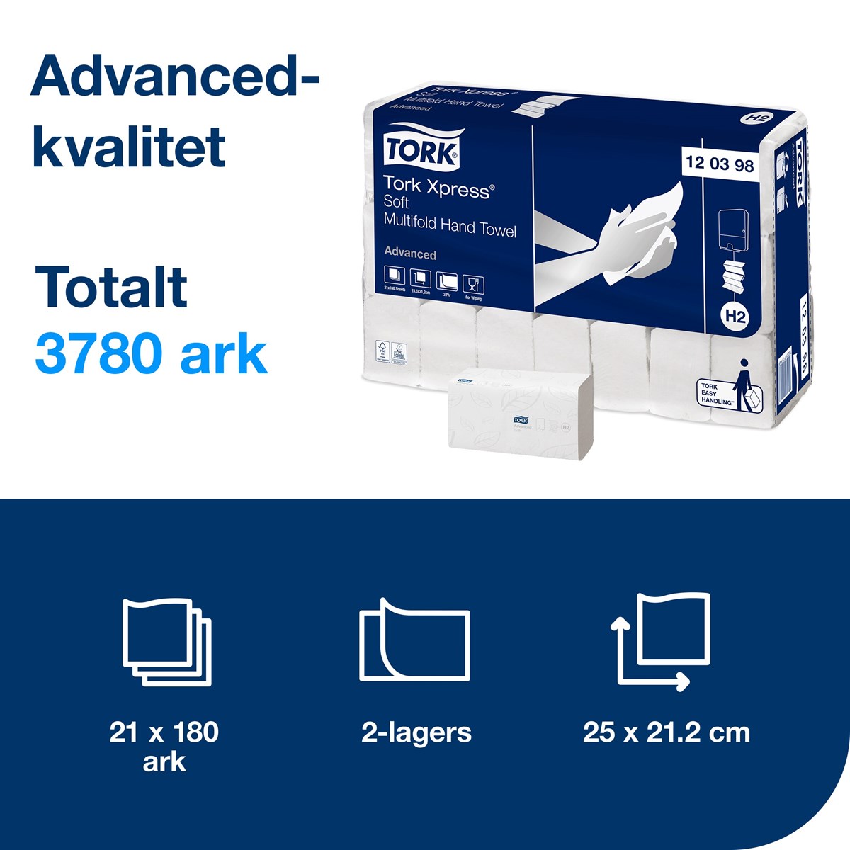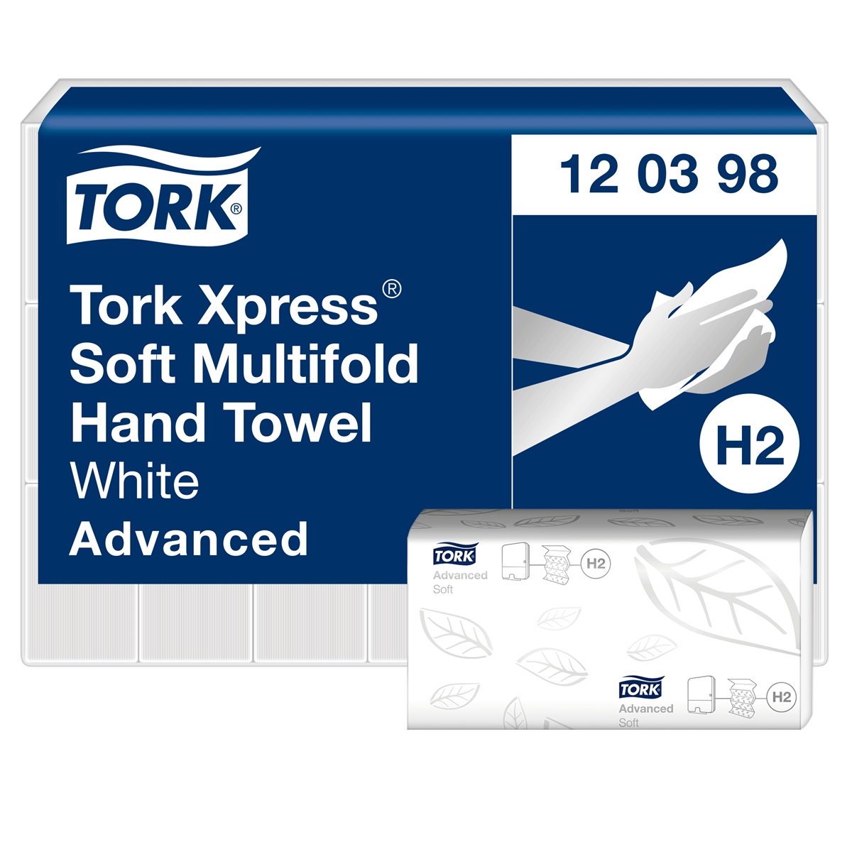 Skapa trevliga toalettutrymmen för gäster med de här mjuka, vita pappershanddukarna. Händerna torkas snabbt och skonsamt tack vare deras behagliga kvalitet och höga absorptionsförmåga. Handdukarna har dessutom en prisvärd storlek som är lämplig för miljöer inom sjukvård, fabriker, industrier och skolor. Maximera hygienen och minimera avfallet genom att använda dem med en Tork Xpress® dispenser som matar ut en handduk i taget, vilket säkerställer att användarna bara rör och tar handdukarna de behöver.