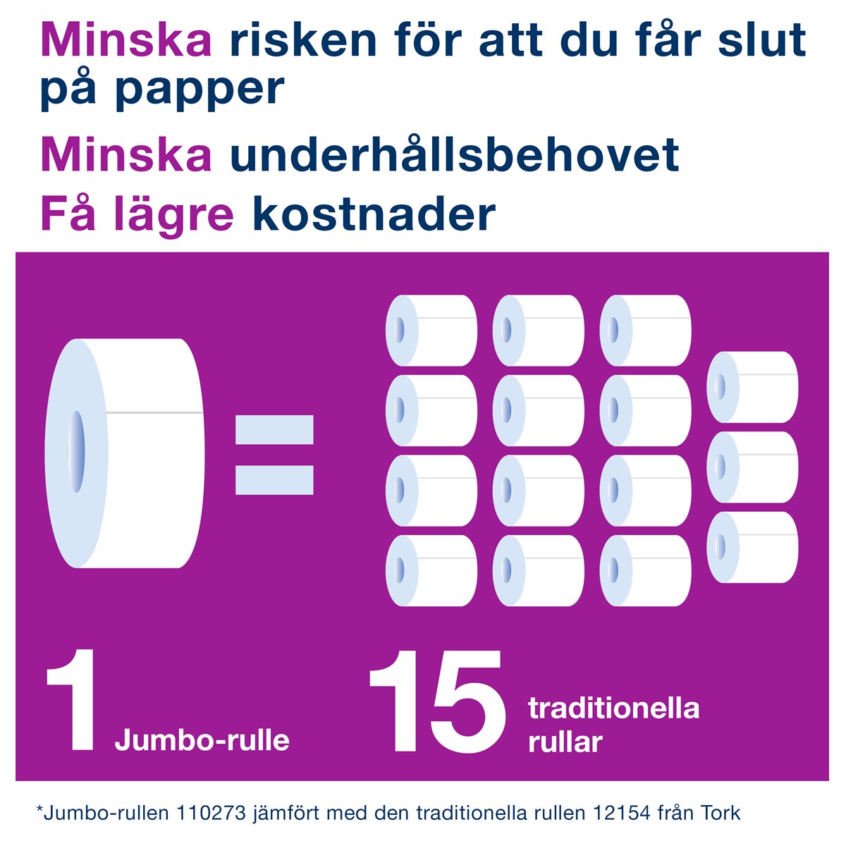 Systemet Tork Jumbo innebär effektivt utnyttjande av tiden och minskade kostnader och erbjuder mycket mer toalettpapper än standardrullar. Tork Universal Jumbo toalettpapper med 1 lager tillgodoser de grundläggande behoven i ett toalettutrymme, erbjuder bra värde för pengarna och är lämpligt för platser med hög besöksfrekvens.